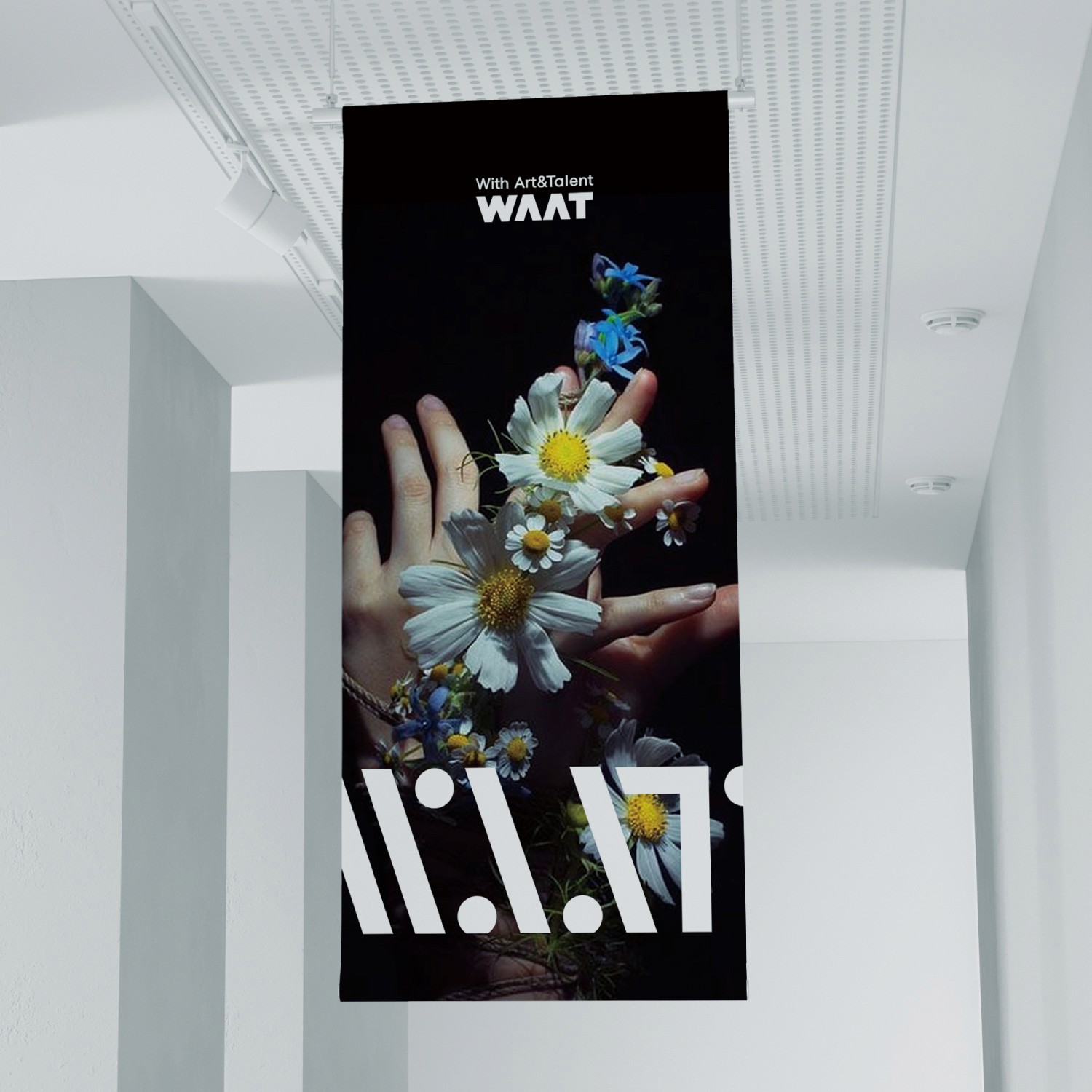 아트와 재능을 연결하는 플랫폼, WAAT입니다. 절제된 블랙 베이스 위에 리듬감 있는 그래픽 요소를 더해, 창작과 표현의 에너지를 현대적으로 재해석한 엔터테인먼트 브랜드입니다.