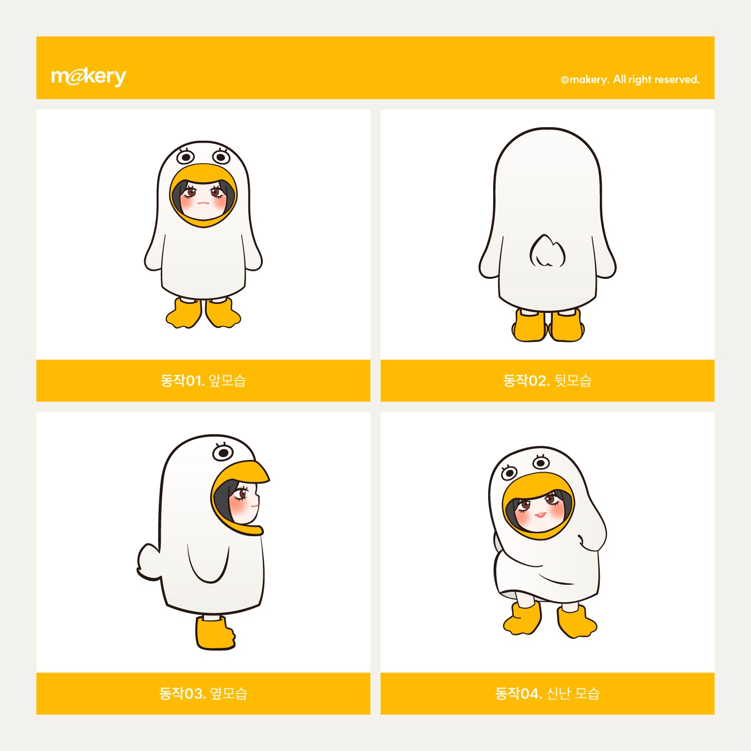오리 코스튬을 입은 소녀 캐릭터로, 유쾌하고 개성 있는 매력을 가지고 있습니다. 자유로운 감성과 귀여움을 동시에 표현하며 다양한 콘텐츠에 어울리는 캐릭터입니다.
