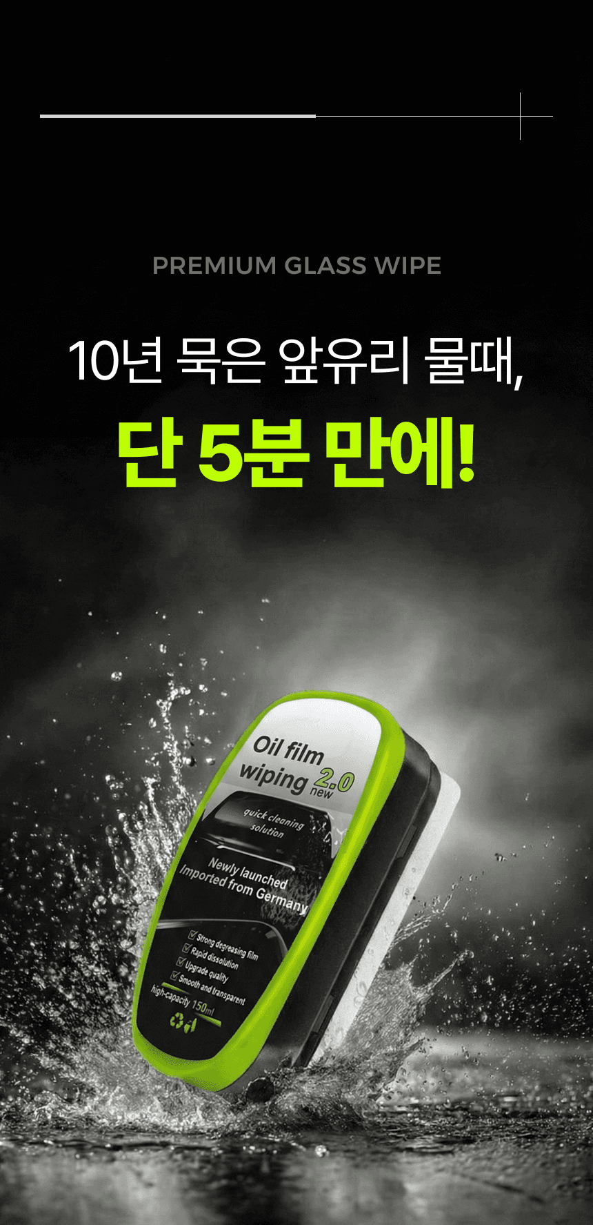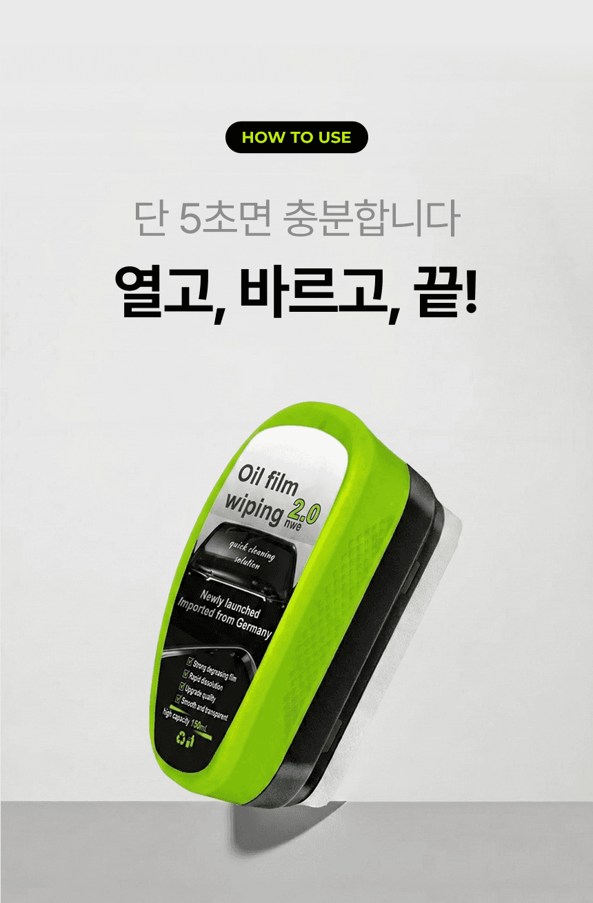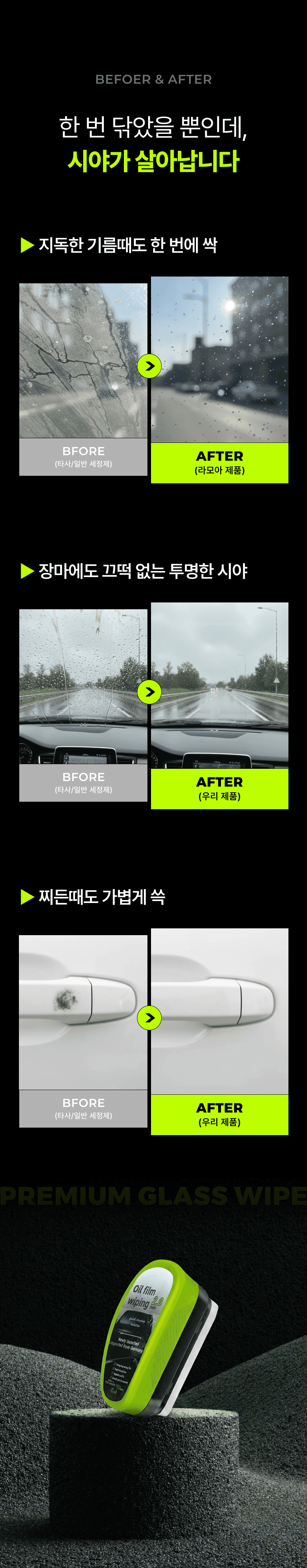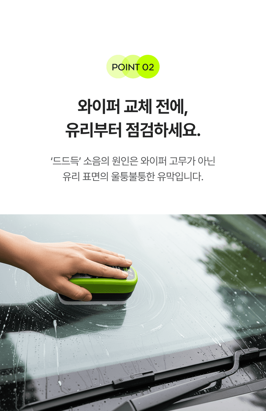 운전자의 안전한 시야 확보를 위한 자동차 전용 '유리닦이' 상세페이지입니다. 유막 제거와 물기 제거의 완벽한 성능을 직관적인 비주얼로 시각화하였으며, 차량의 곡선에 밀착되는 인체공학적 디자인을 강조하여 자동차 관리의 효율성과 심미적 만족을 동시에 제안합니다.