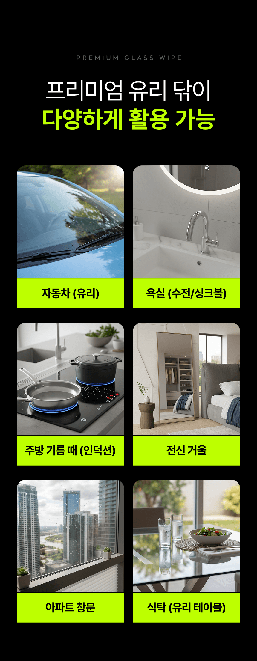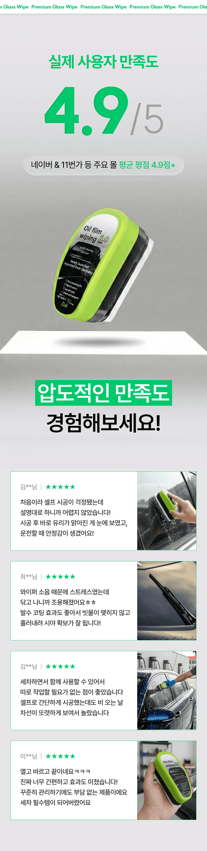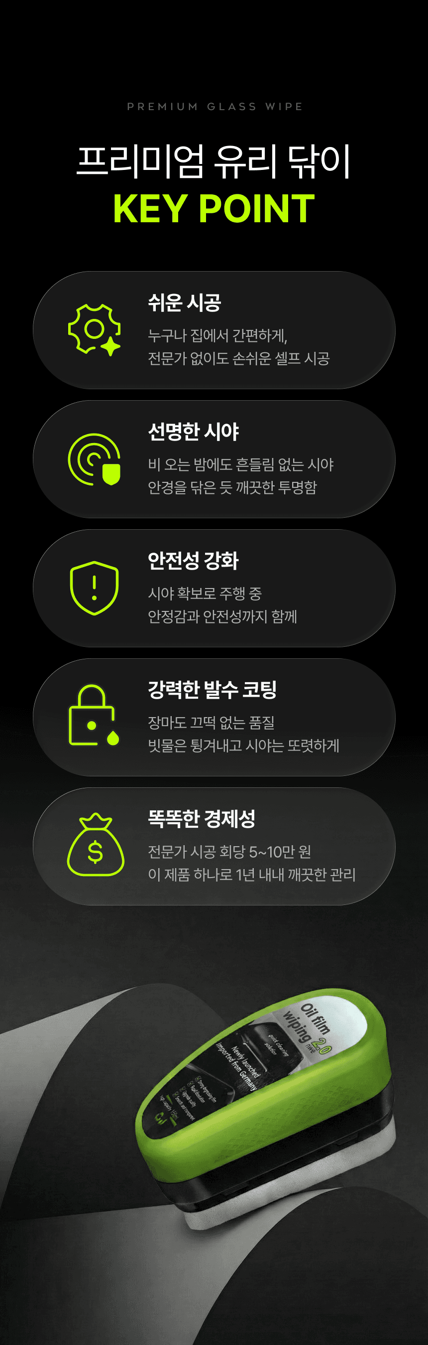 운전자의 안전한 시야 확보를 위한 자동차 전용 '유리닦이' 상세페이지입니다. 유막 제거와 물기 제거의 완벽한 성능을 직관적인 비주얼로 시각화하였으며, 차량의 곡선에 밀착되는 인체공학적 디자인을 강조하여 자동차 관리의 효율성과 심미적 만족을 동시에 제안합니다.