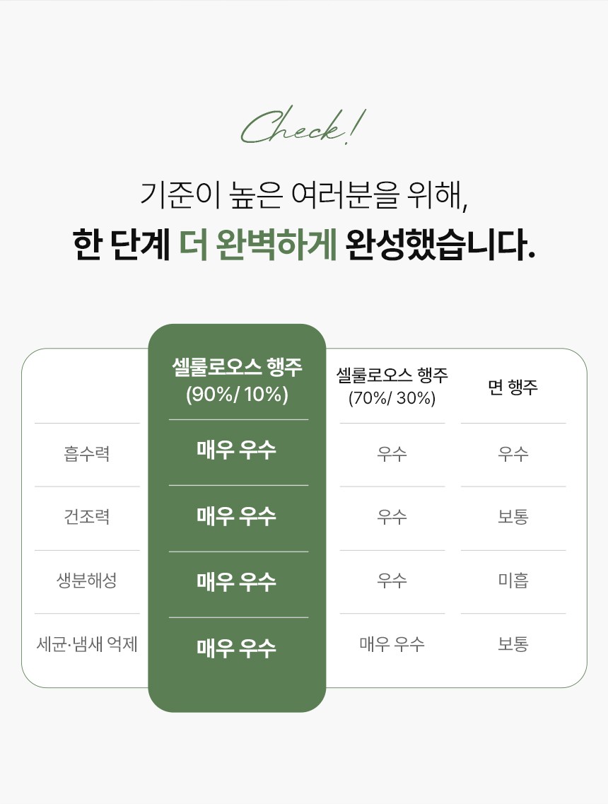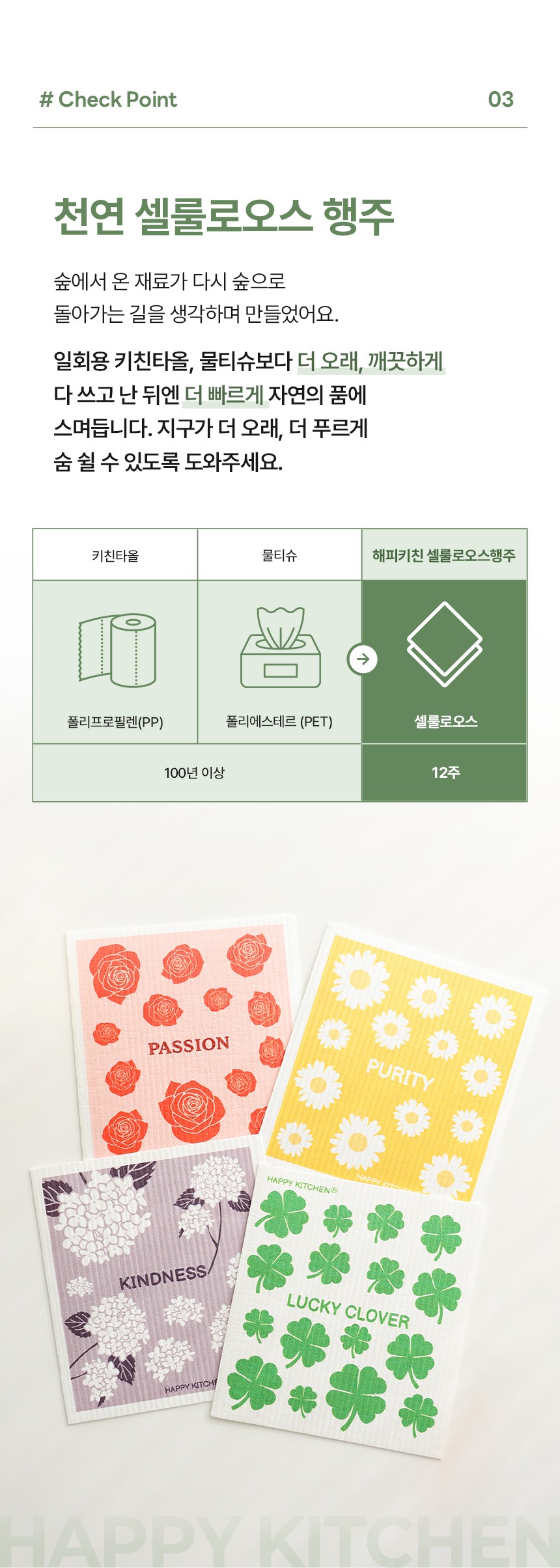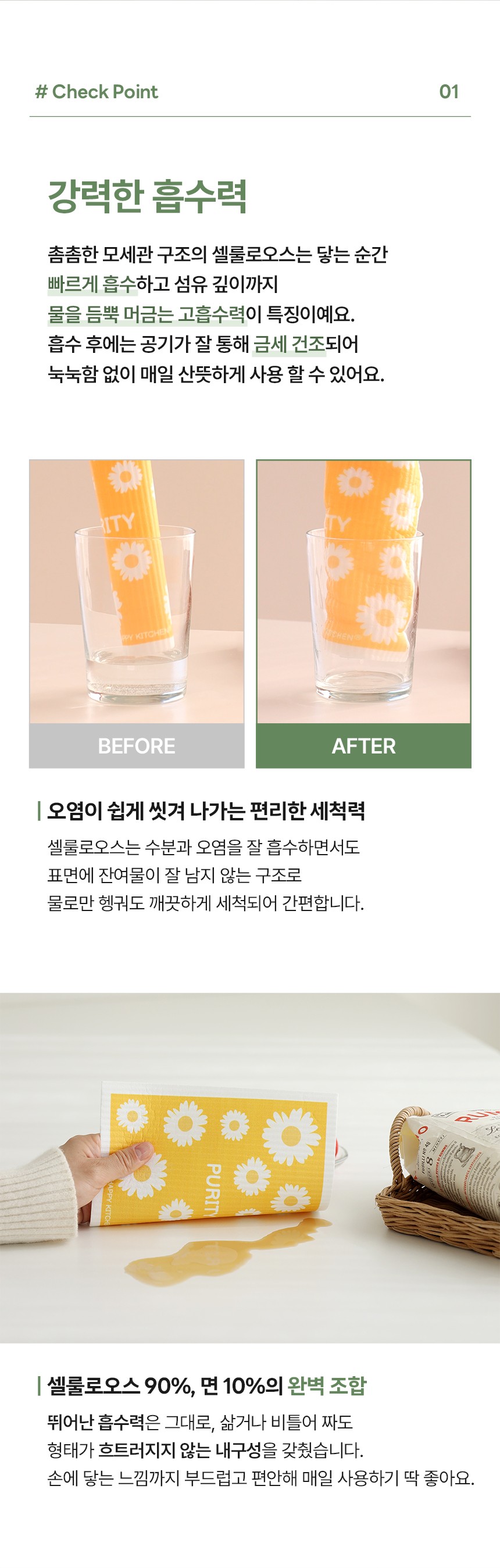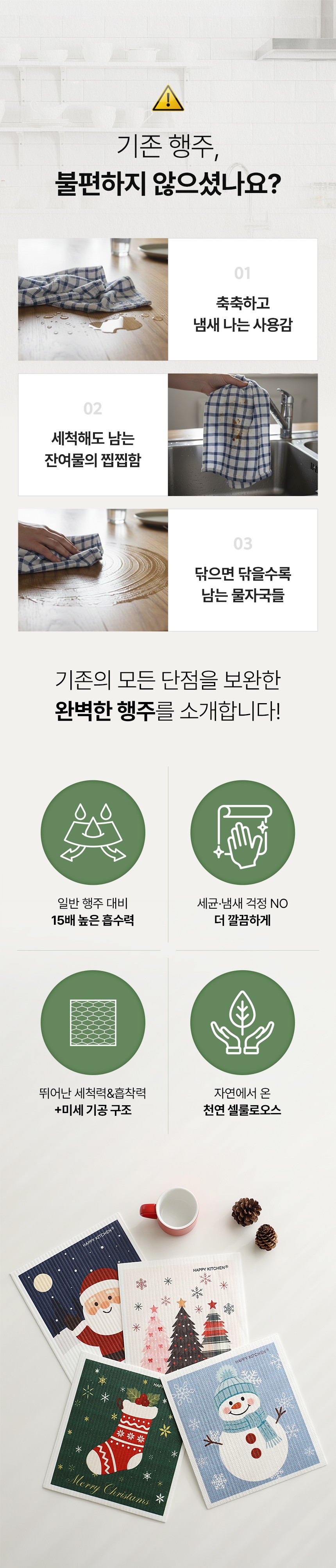 식물 유래 천연 셀룰로오스 소재를 사용하여 미세 플라스틱 걱정 없이 안전하게 사용할 수 있는 친환경 행주 상세페이지입니다. 자체 무게의 수십 배를 흡수하는 강력한 흡수력과 빠른 건조 특성을 시각화하였으며, 세탁기 사용이 가능한 내구성을 통해 위생적이고 지속 가능한 주방 라이프스타일을 제안하는 브랜드 가치를 전달합니다.