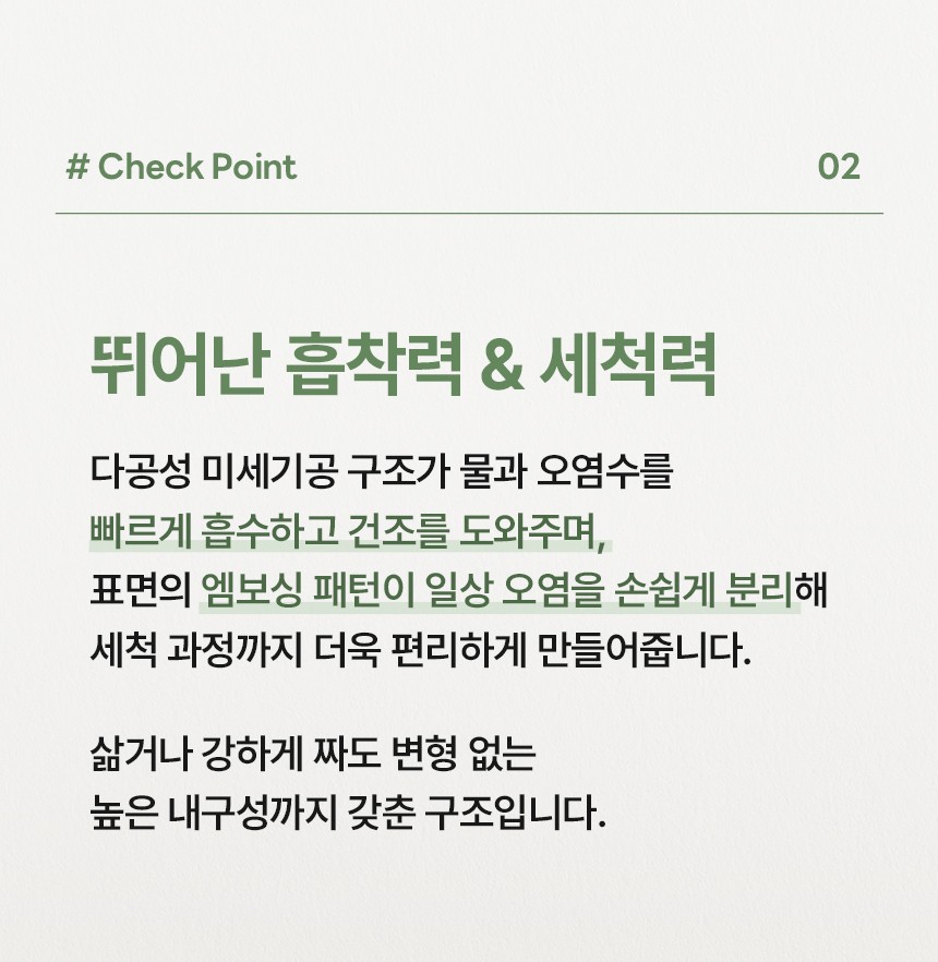 미세 플라스틱 불검출 인증과 수분을 즉각적으로 흡수하는 테스트 영상을 전면에 배치하여 제품의 기능성을 입증했습니다. 불필요한 수식어 대신 감각적인 패턴 디자인과 건조 후의 형태 안정성을 강조한 비주얼 시스템을 구축하였으며, 다용도 활용 사례를 상세히 노출하여 실용적인 살림 아이템으로 브랜드를 성공적으로 포지셔닝했습니다.