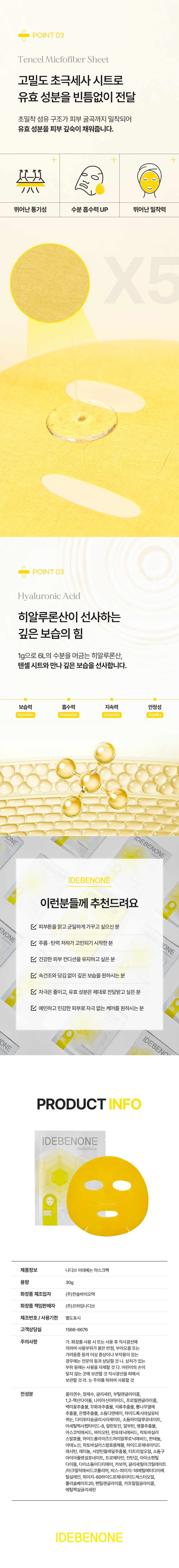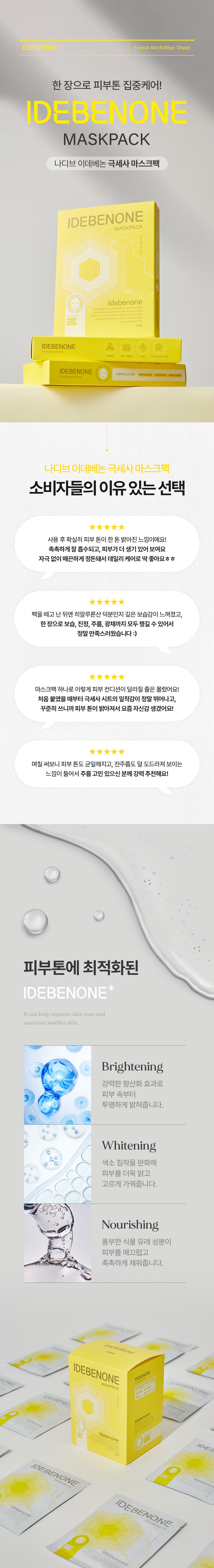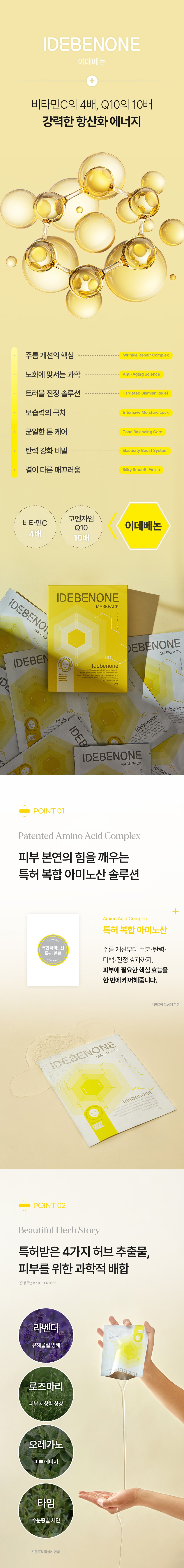 항산화 성분인 이데베논을 시트 한 장에 응축한 프리미엄 마스크팩 상세페이지입니다. 성분의 핵심인 옐로우 컬러를 시각적 테마로 활용하여 강력한 항산화 에너지를 형상화하였으며, 피부에 밀착되는 시트의 질감과 즉각적인 영양 공급 과정을 감각적인 레이아웃으로 전달합니다.