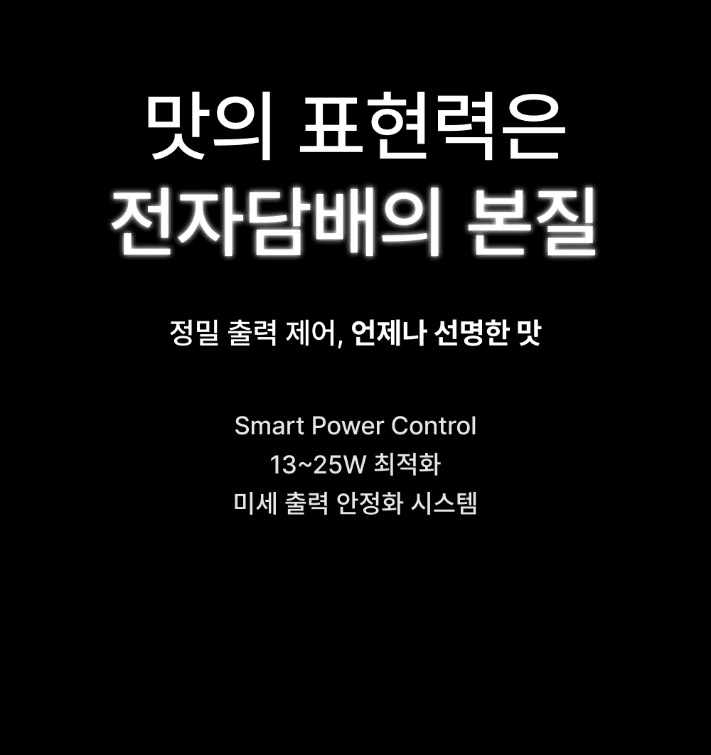 Smart Power Control 기반의 출력 안정화 구조를 통해 일관된 맛 표현과 부드러운 사용 경험을 강조했습니다. 프리미엄 디자인과 감성 카피를 결합해 브랜드 신뢰도와 구매 전환 흐름을 동시에 강화했습니다.