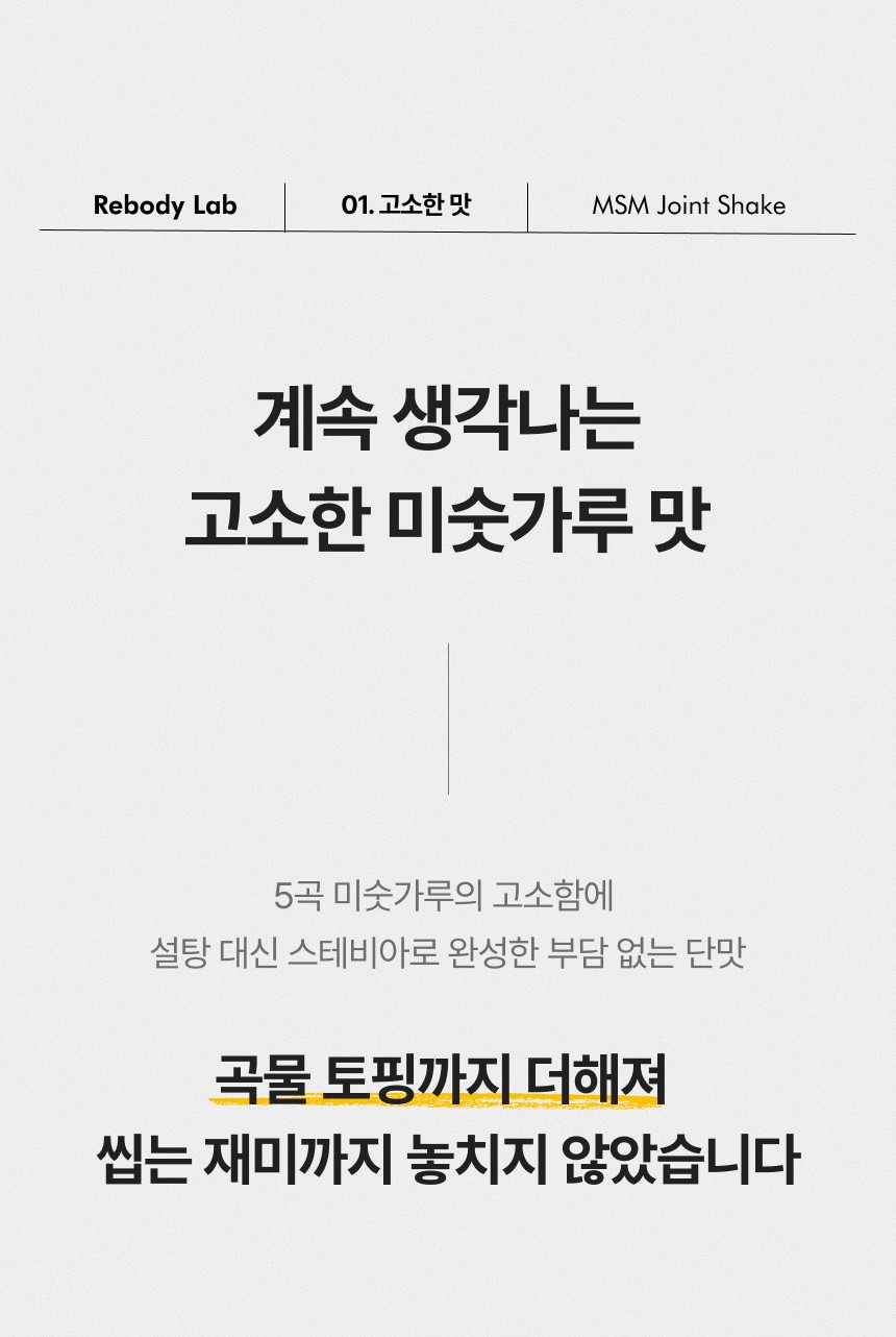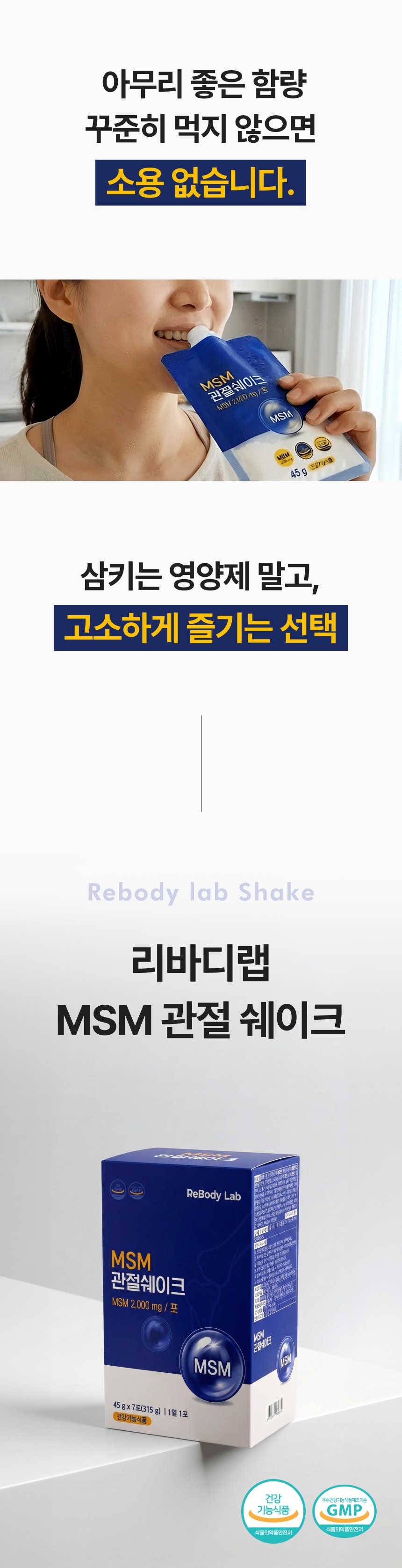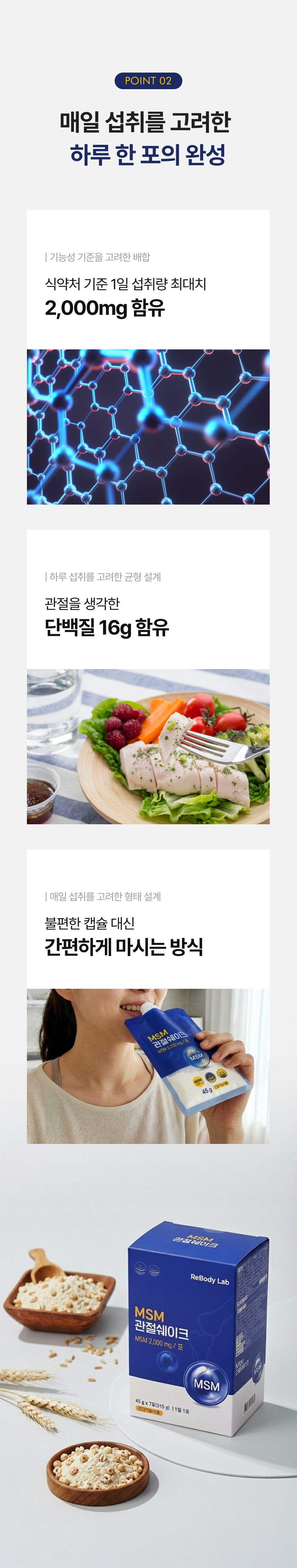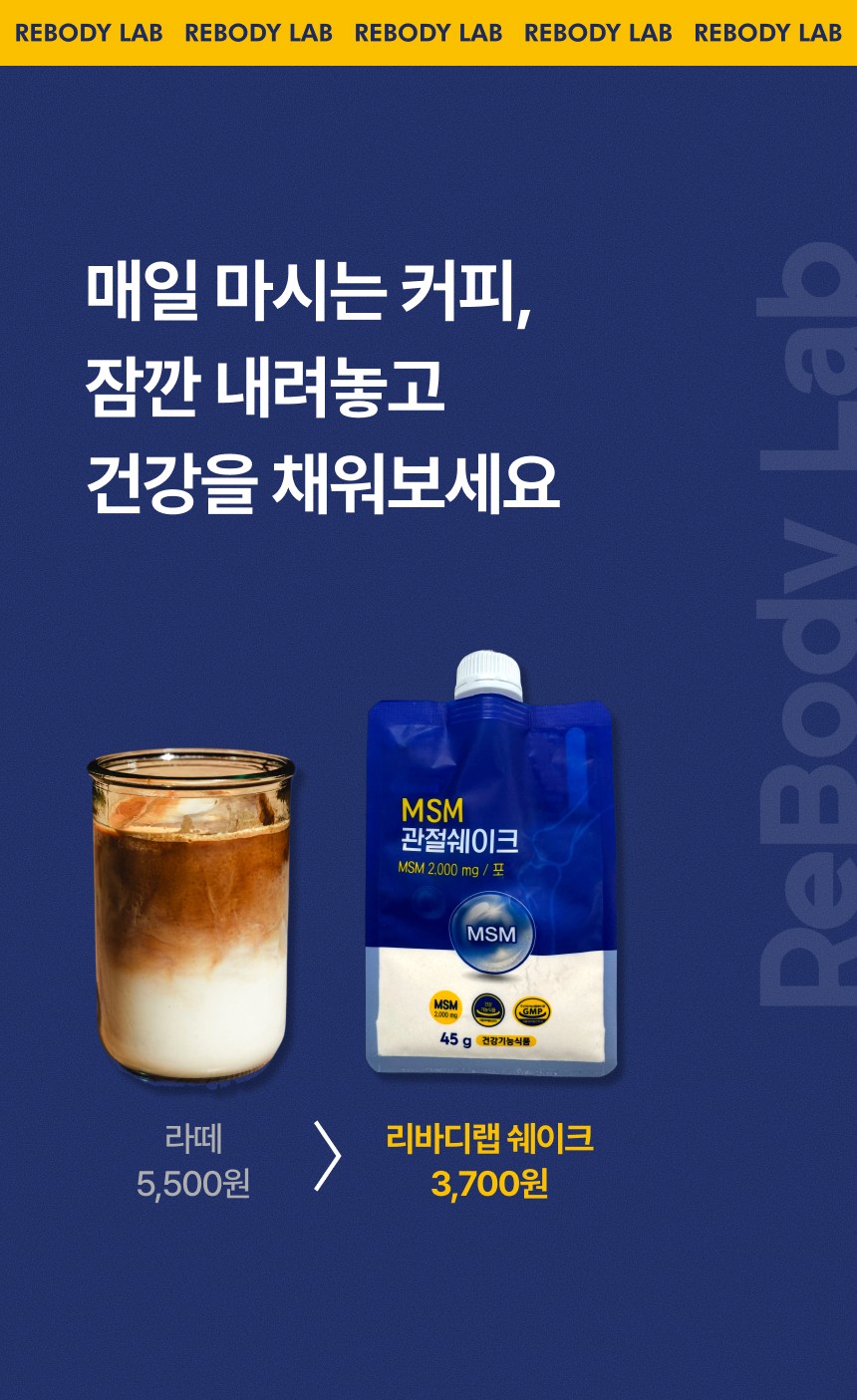 관절 및 연골 건강에 도움을 주는 MSM 성분을 맛있고 간편하게 섭취할 수 있도록 설계된 건강 쉐이크 상세페이지입니다. 순도 높은 MSM 배합비와 풍부한 영양 성분을 시각화하였으며, 바쁜 일상 속에서 식사 대용으로 즐기며 관절 건강을 관리할 수 있는 라이프스타일 중심의 브랜드 가치를 전달합니다.