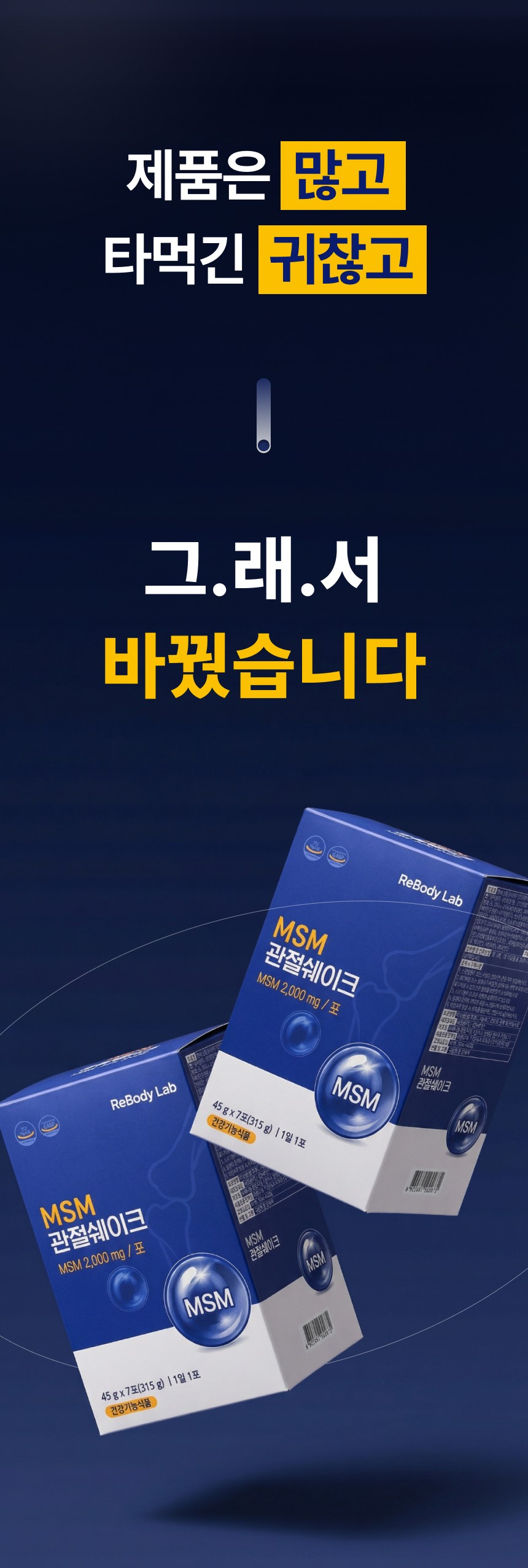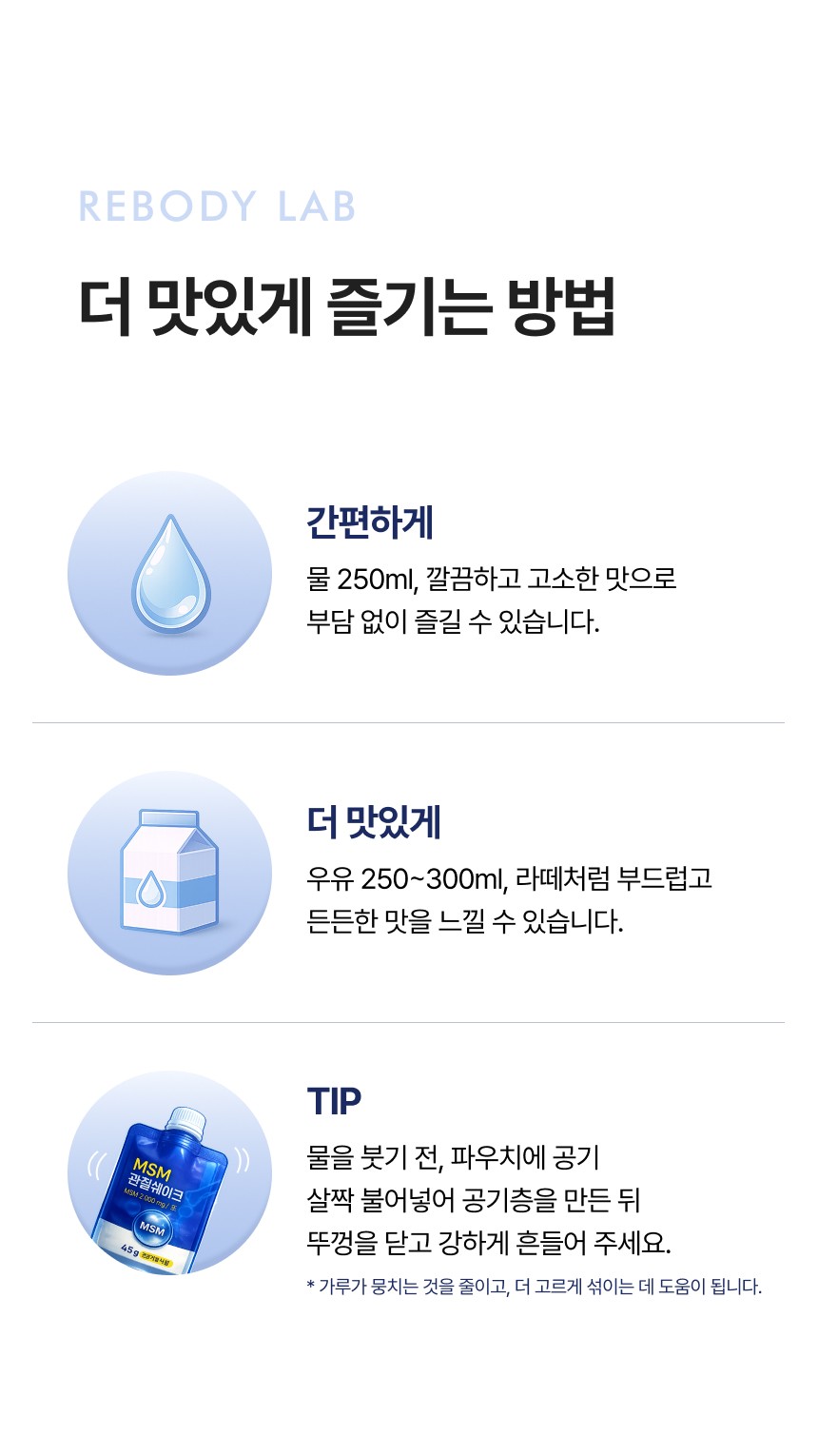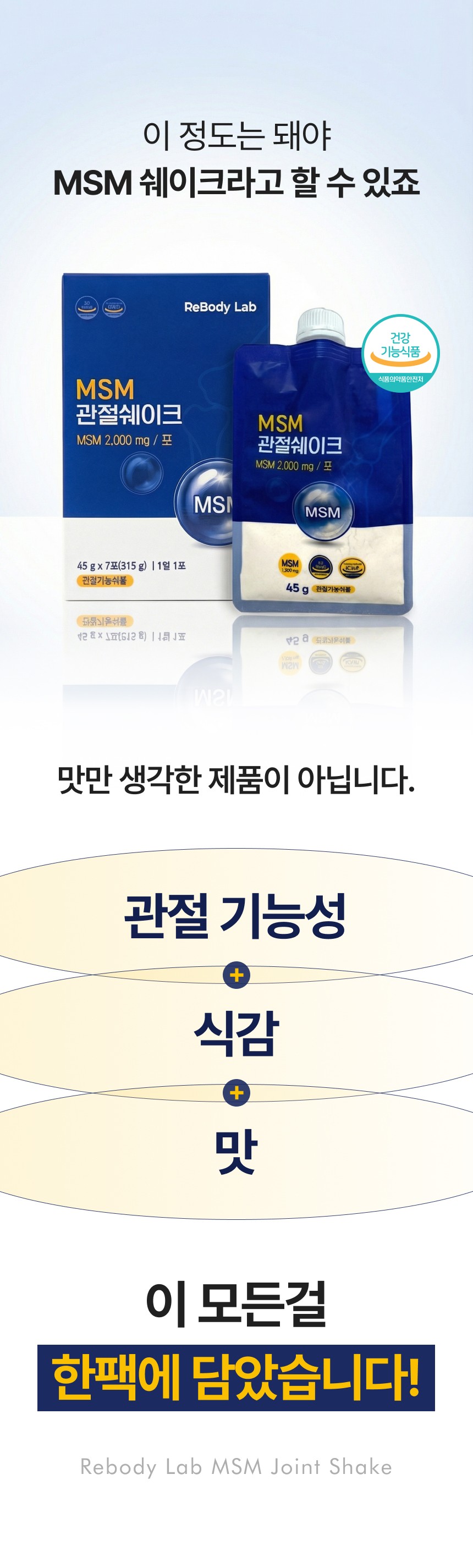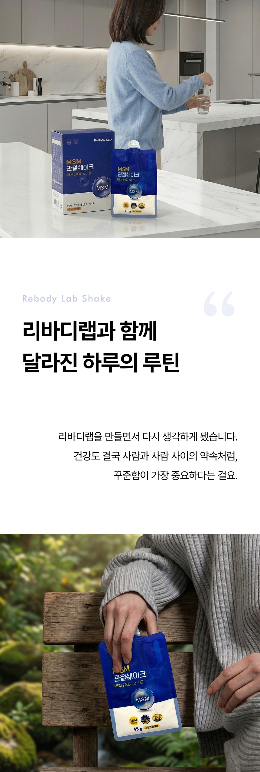 관절 및 연골 건강에 도움을 주는 MSM 성분을 맛있고 간편하게 섭취할 수 있도록 설계된 건강 쉐이크 상세페이지입니다. 순도 높은 MSM 배합비와 풍부한 영양 성분을 시각화하였으며, 바쁜 일상 속에서 식사 대용으로 즐기며 관절 건강을 관리할 수 있는 라이프스타일 중심의 브랜드 가치를 전달합니다.