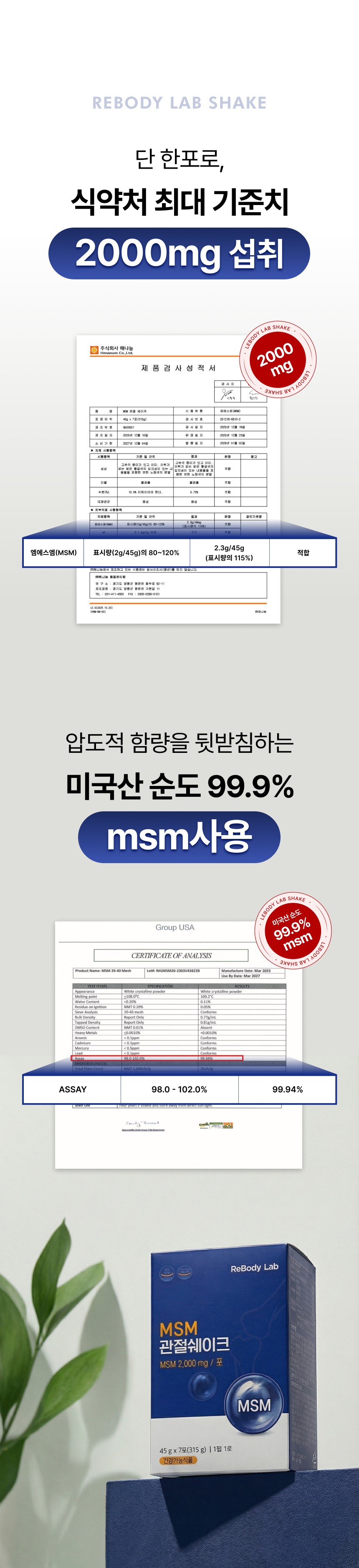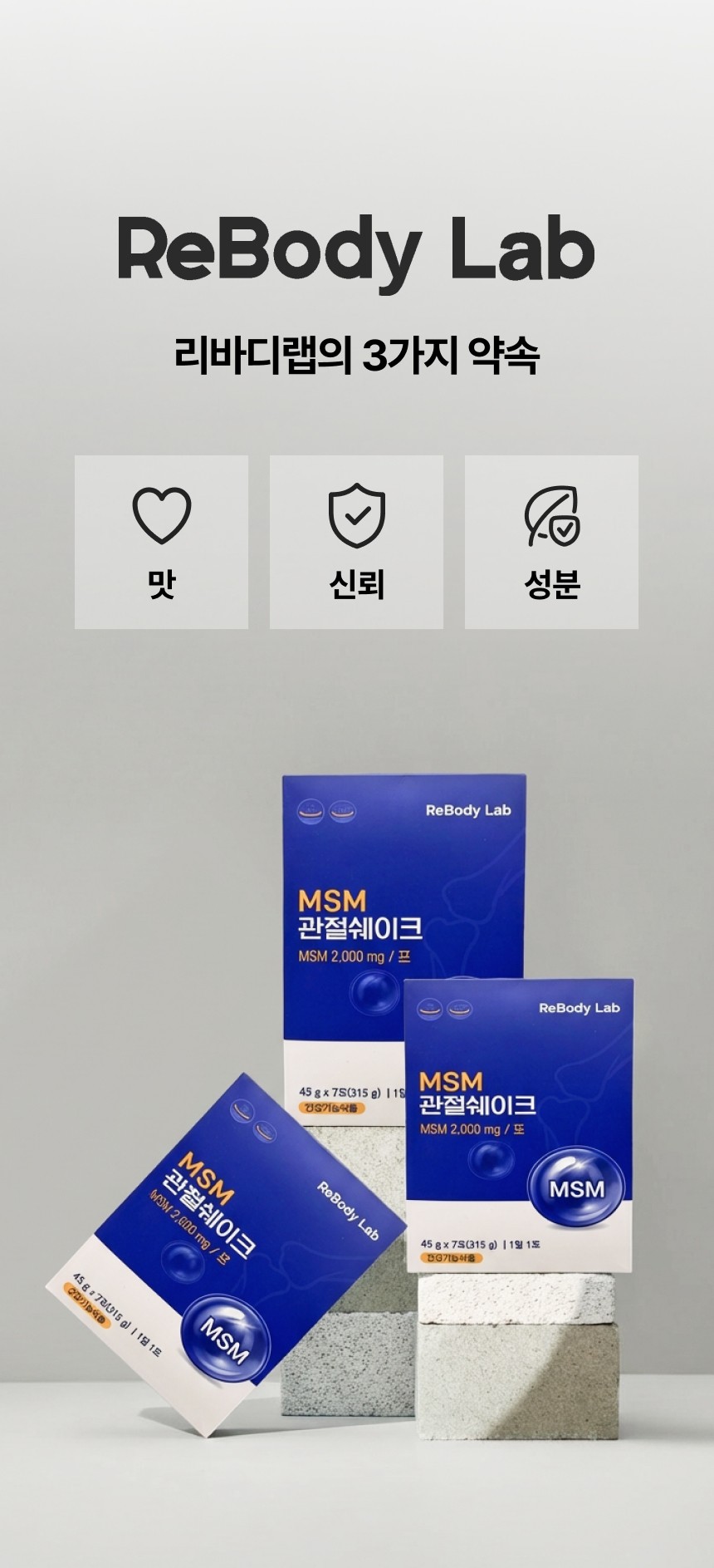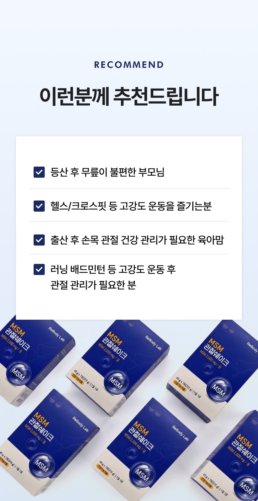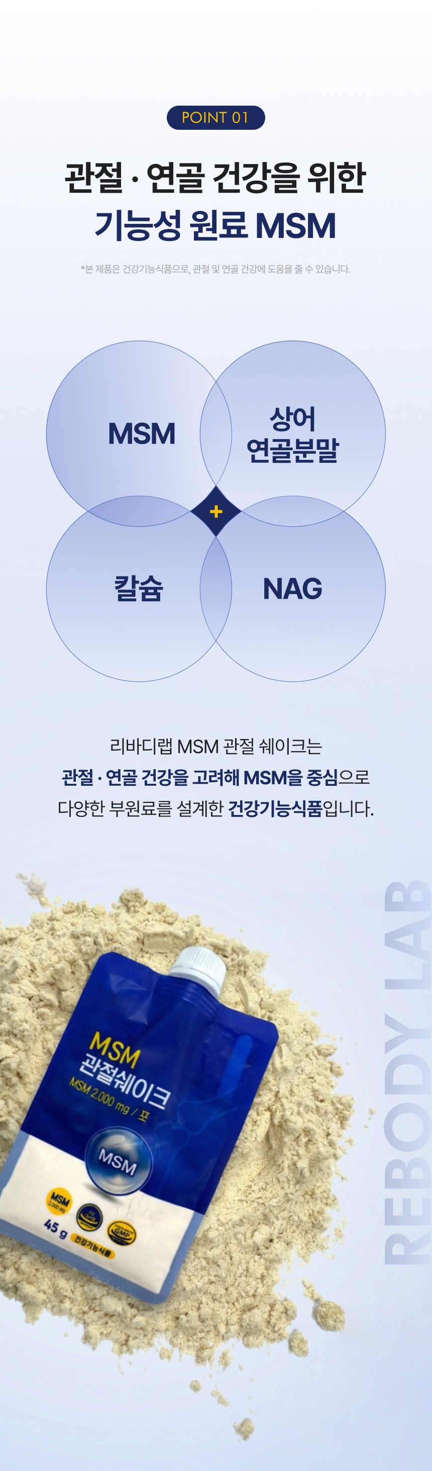 관절 및 연골 건강에 도움을 주는 MSM 성분을 맛있고 간편하게 섭취할 수 있도록 설계된 건강 쉐이크 상세페이지입니다. 순도 높은 MSM 배합비와 풍부한 영양 성분을 시각화하였으며, 바쁜 일상 속에서 식사 대용으로 즐기며 관절 건강을 관리할 수 있는 라이프스타일 중심의 브랜드 가치를 전달합니다.
