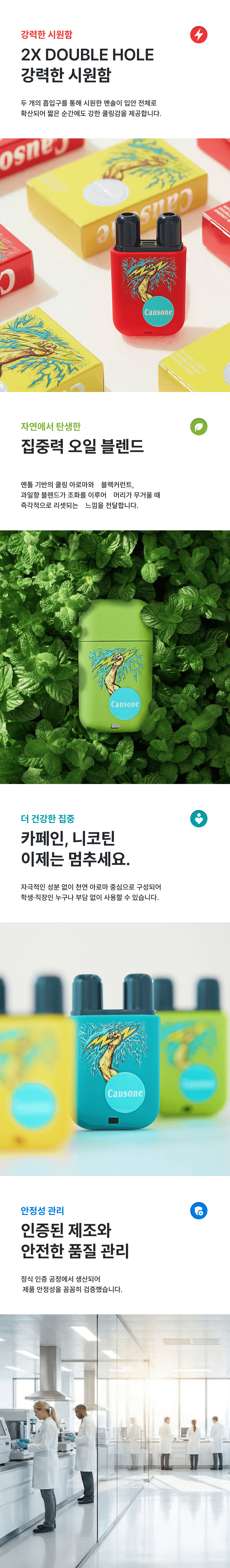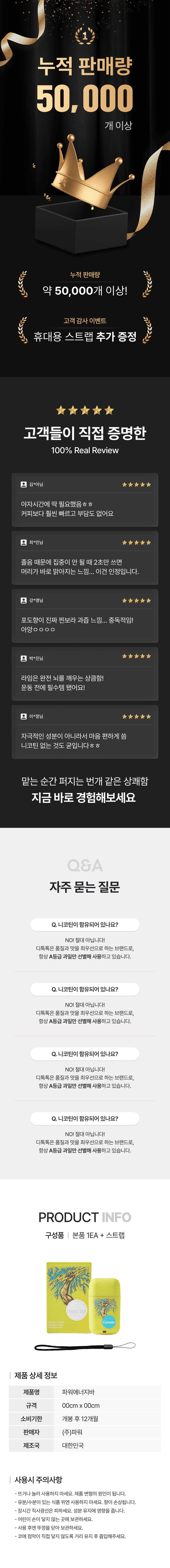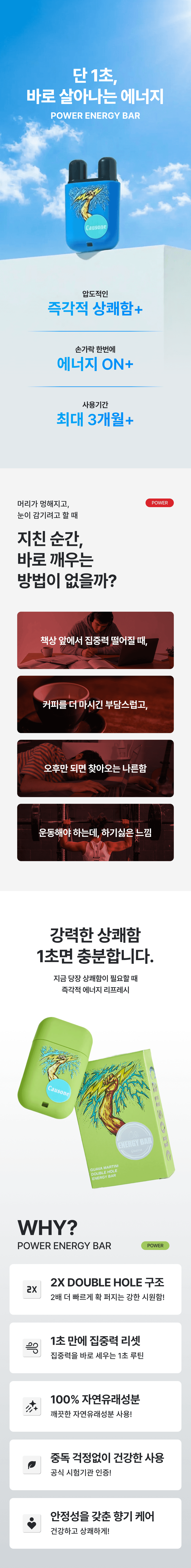 즉각적인 상쾌함과 에너지 전달에 초점을 맞춘 퍼포먼스형 제품의 상세페이지 디자인입니다. 강렬한 컬러 대비와 직관적인 메시지 구조를 통해 제품의 핵심 효능을 빠르게 인지시키고, 사용 상황 중심의 콘텐츠 흐름으로 소비자의 공감과 행동을 유도하도록 설계했습니다.
