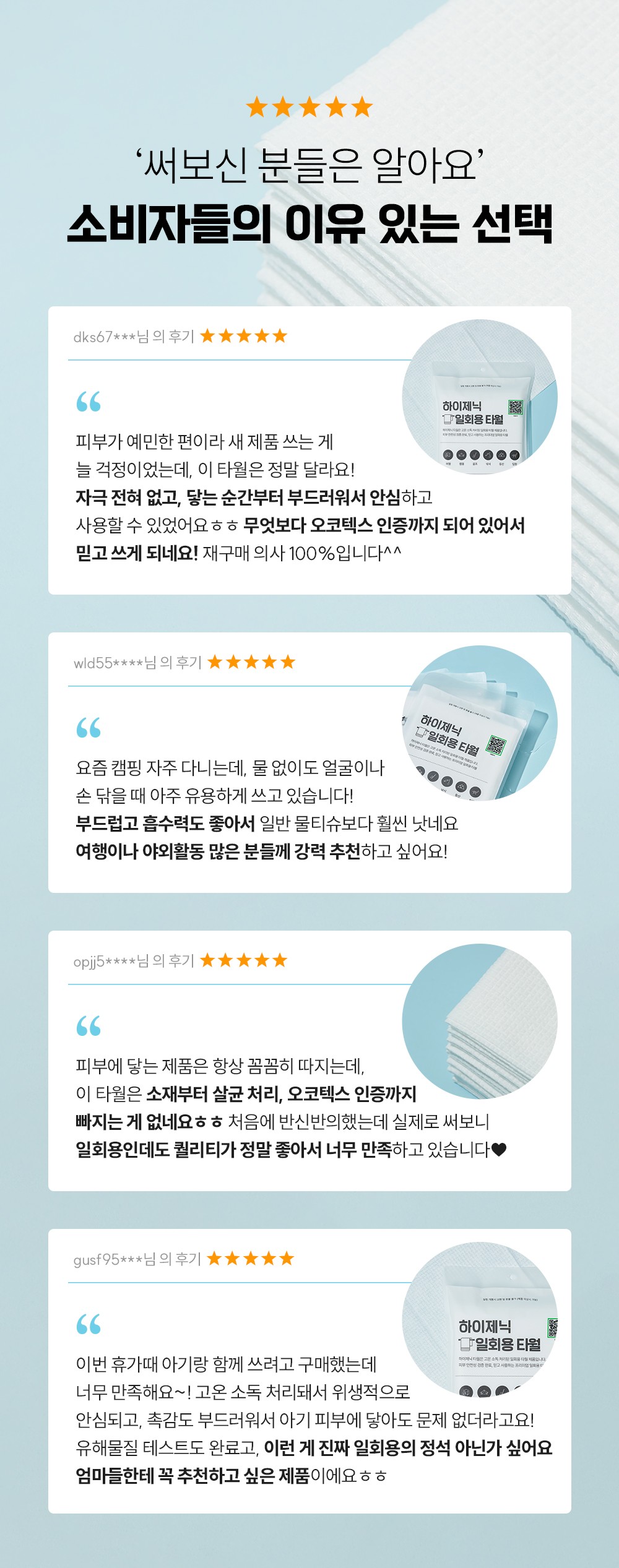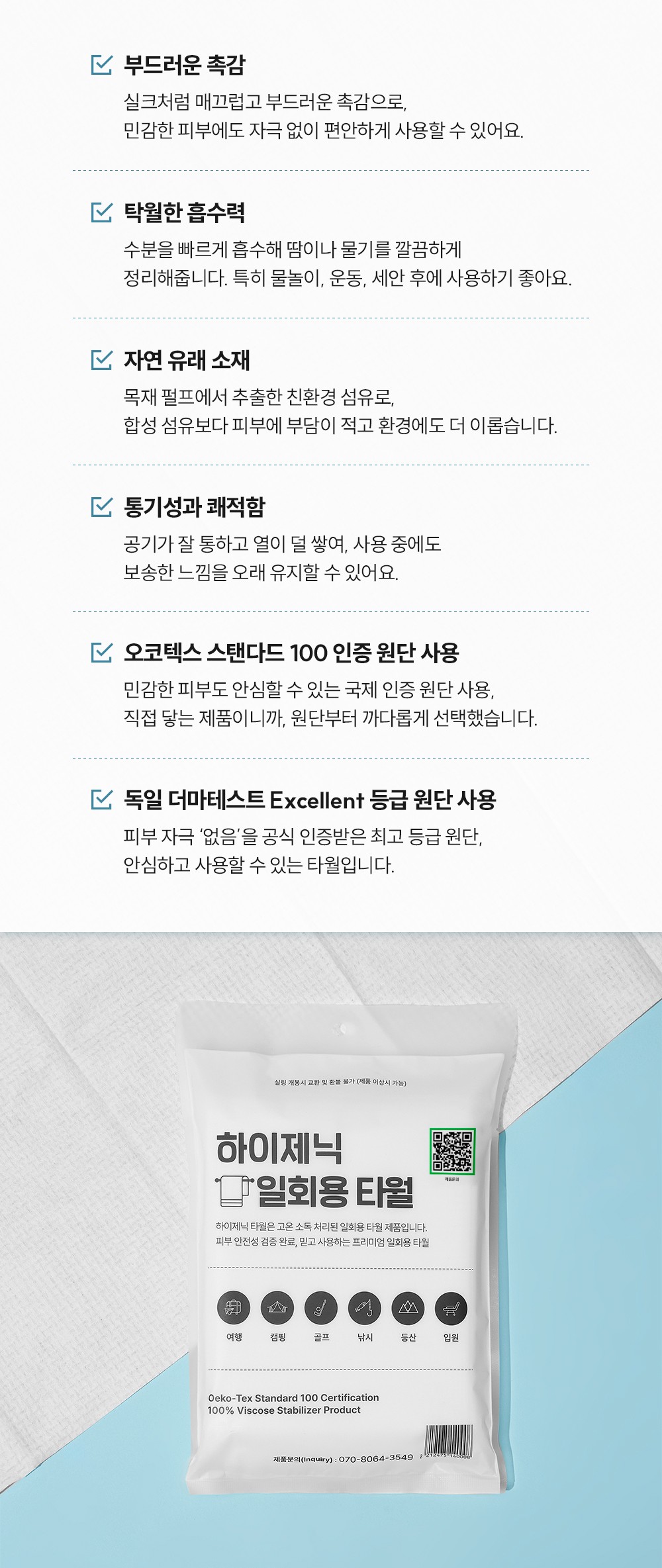 세균 번식 걱정 없이 매일 새것처럼 위생적으로 사용할 수 있는 프리미엄 일회용 페이스 타월 상세페이지입니다. 먼지 날림이 없는 엠보싱 원단의 부드러운 촉감과 세안 후 잔여 물기를 즉각적으로 제거하는 흡수력을 시각화하였으며, 민감한 피부를 보호하고 삶의 질을 높여주는 위생적인 스킨케어 루틴을 제안하는 브랜드 가치를 전달합니다.