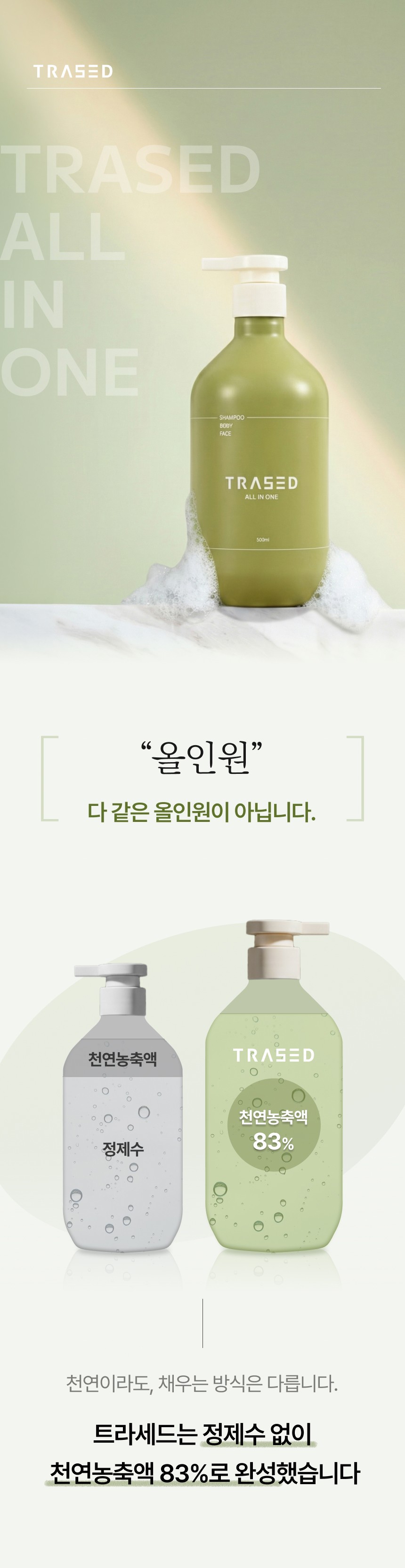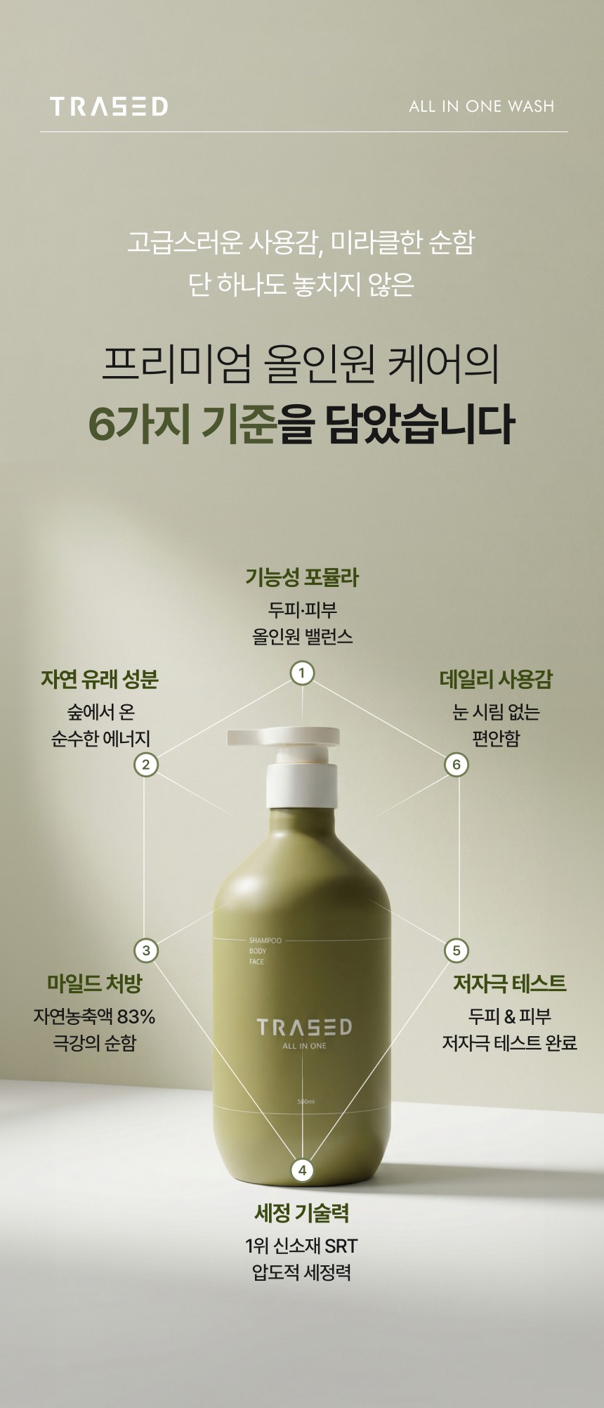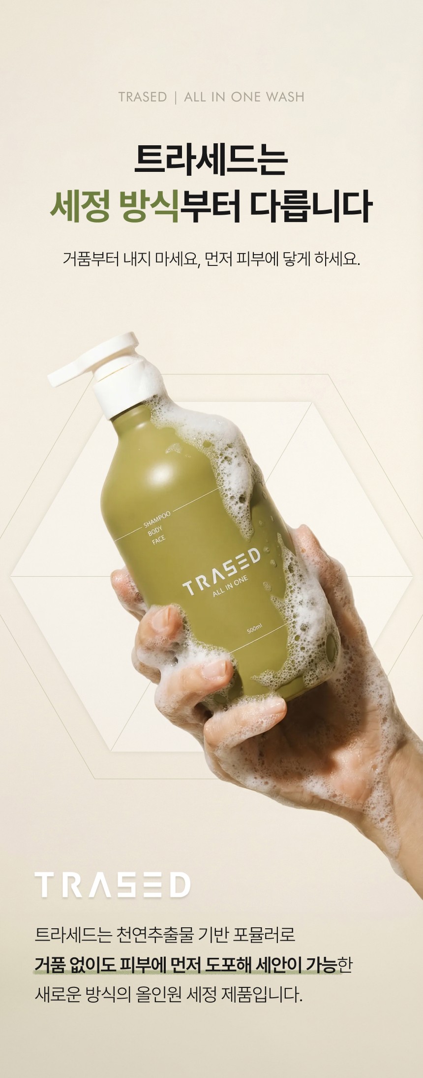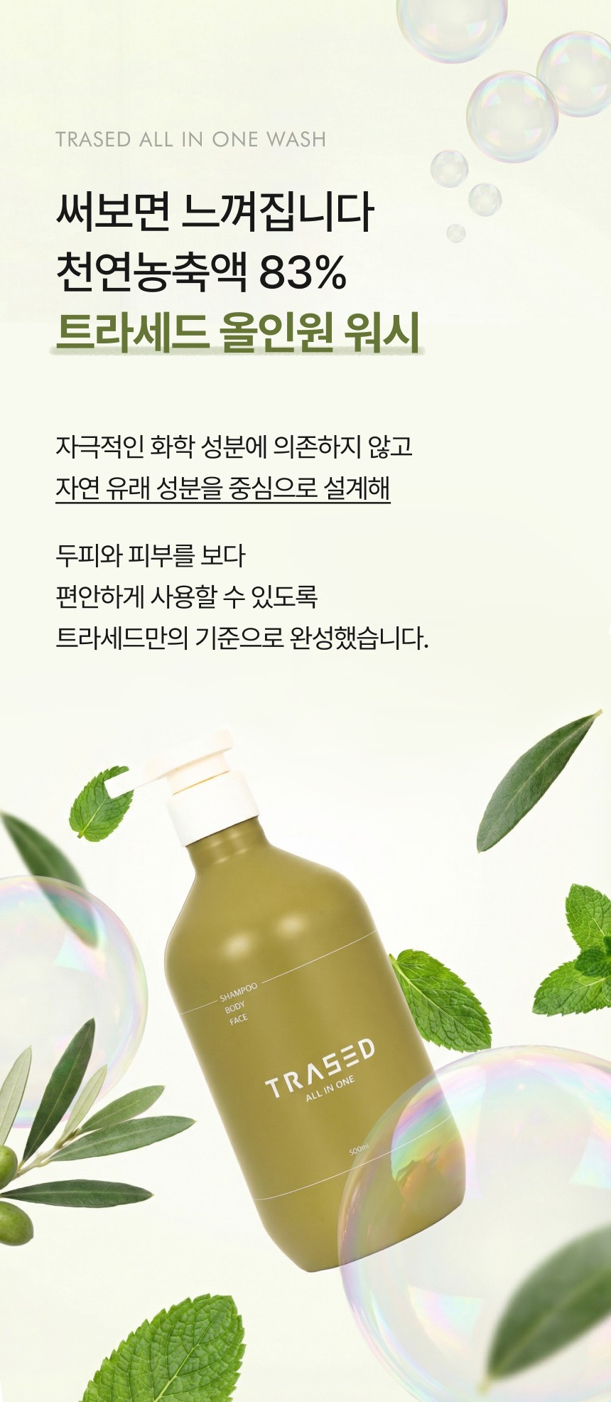 트라세드 올인원 워시는 정제수 없이 천연 농축액 83%를 담은 프리미엄 올인원 워시 '트라세드'의 상세페이지입니다. 브랜드 특유의 내추럴한 무드와 독자적인 세정 기술력을 논리적인 비주얼 시스템으로 시각화하였으며, 절제된 레이아웃을 통해 제품의 본질적인 가치와 신뢰감을 깊이 있게 전달합니다.