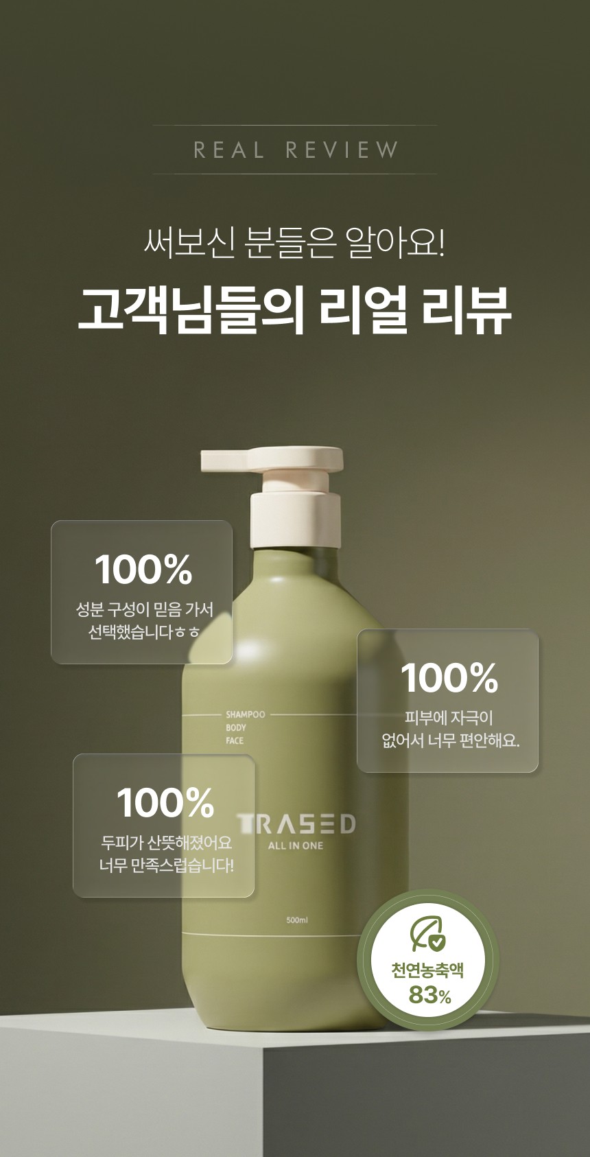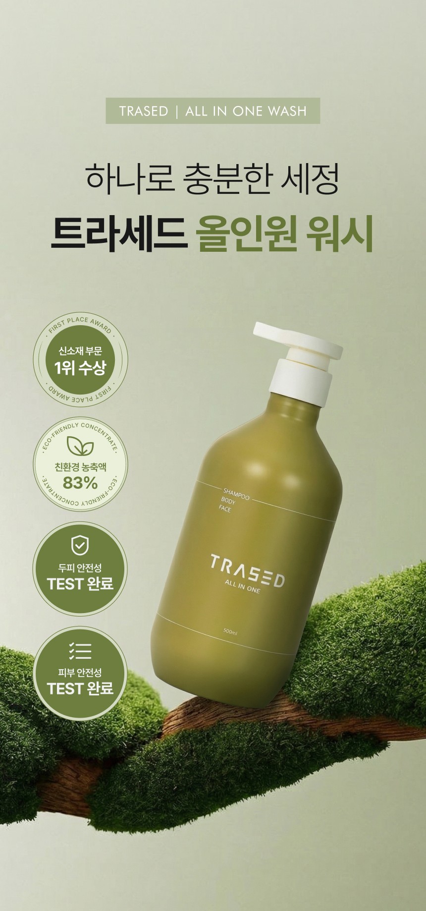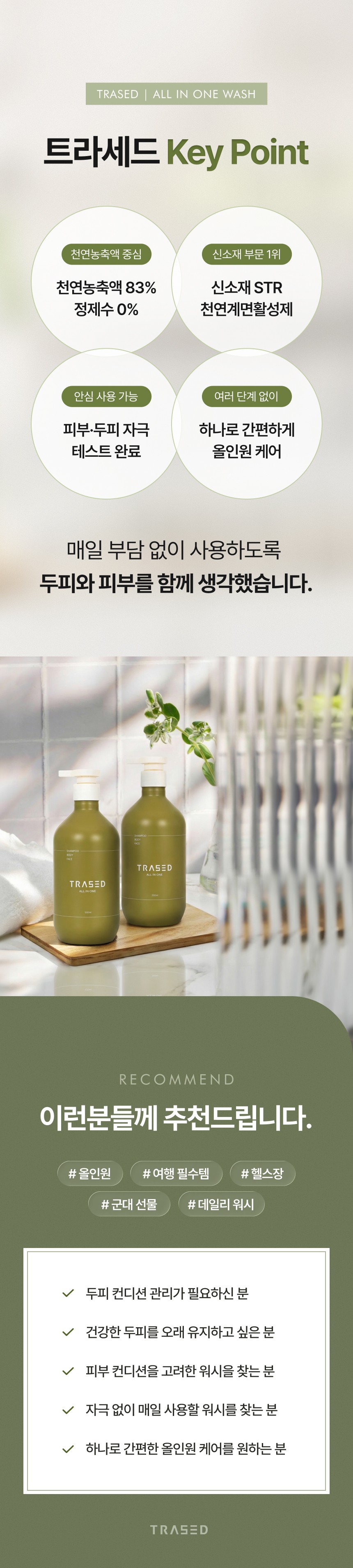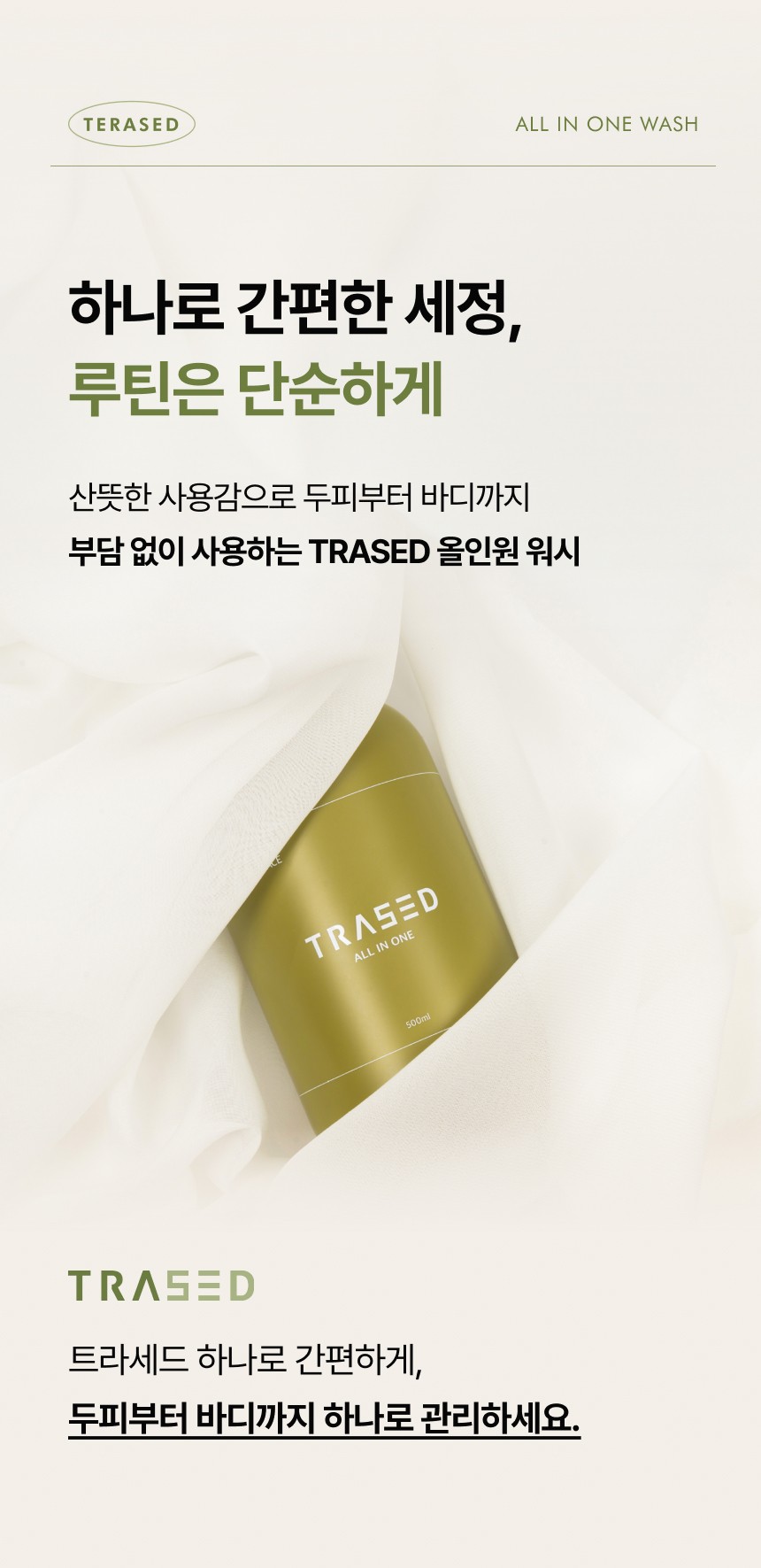 트라세드 올인원 워시는 정제수 없이 천연 농축액 83%를 담은 프리미엄 올인원 워시 '트라세드'의 상세페이지입니다. 브랜드 특유의 내추럴한 무드와 독자적인 세정 기술력을 논리적인 비주얼 시스템으로 시각화하였으며, 절제된 레이아웃을 통해 제품의 본질적인 가치와 신뢰감을 깊이 있게 전달합니다.