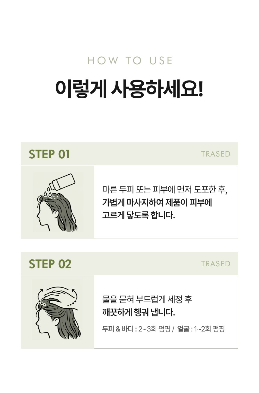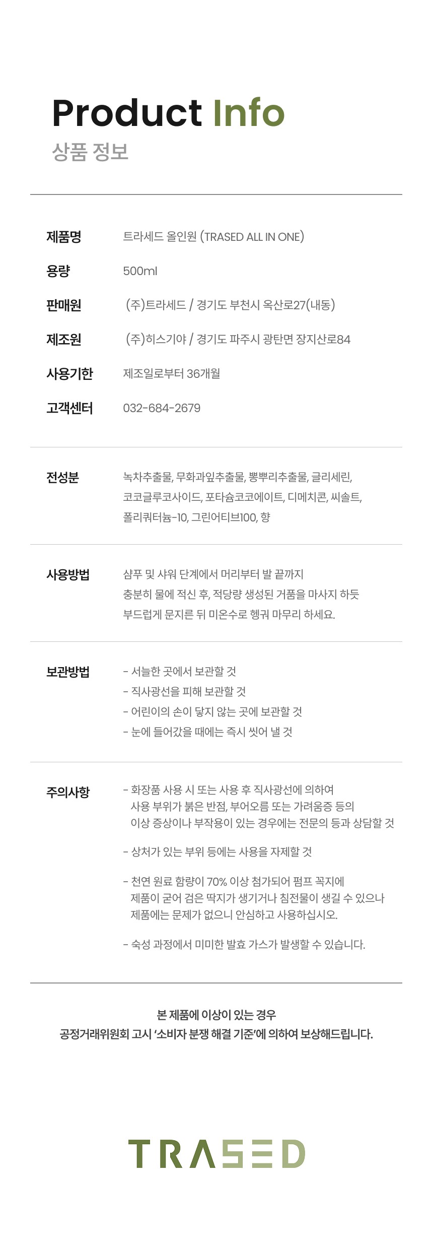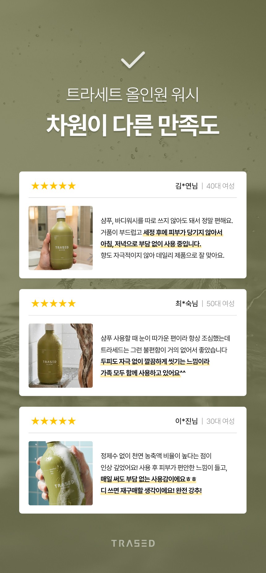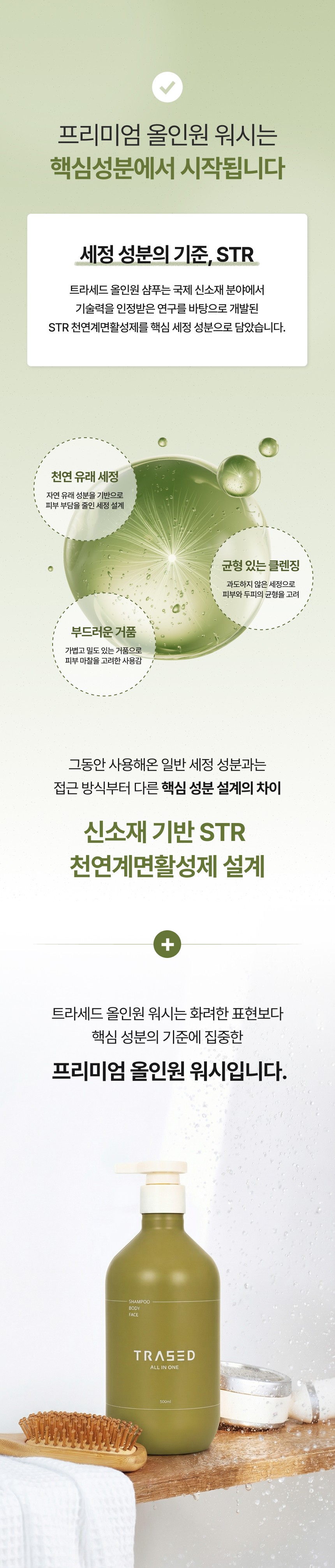 트라세드 올인원 워시는 정제수 없이 천연 농축액 83%를 담은 프리미엄 올인원 워시 '트라세드'의 상세페이지입니다. 브랜드 특유의 내추럴한 무드와 독자적인 세정 기술력을 논리적인 비주얼 시스템으로 시각화하였으며, 절제된 레이아웃을 통해 제품의 본질적인 가치와 신뢰감을 깊이 있게 전달합니다.