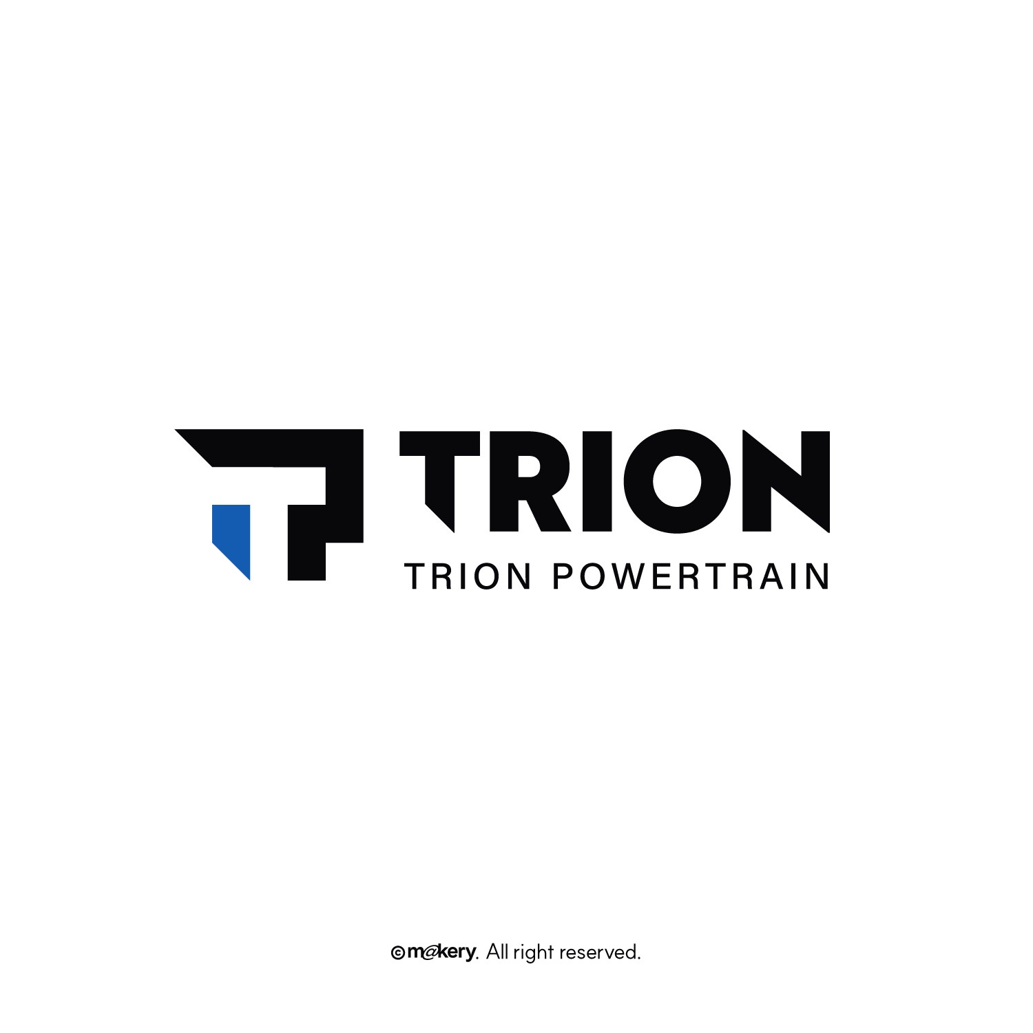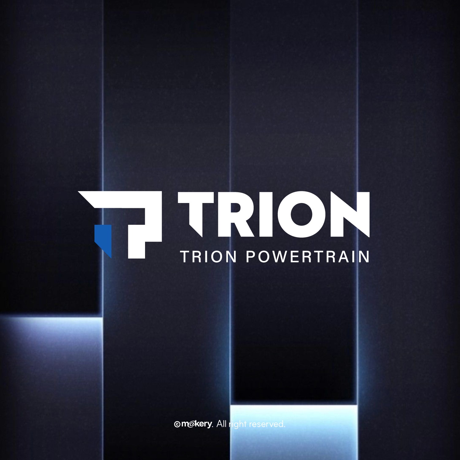 TRION은 고성능 파워트레인 기술을 기반으로 한 첨단 엔지니어링 기업입니다. 강한 직선 구조의 로고는 기술력과 정밀함, 그리고 산업적 신뢰감을 강조합니다.
