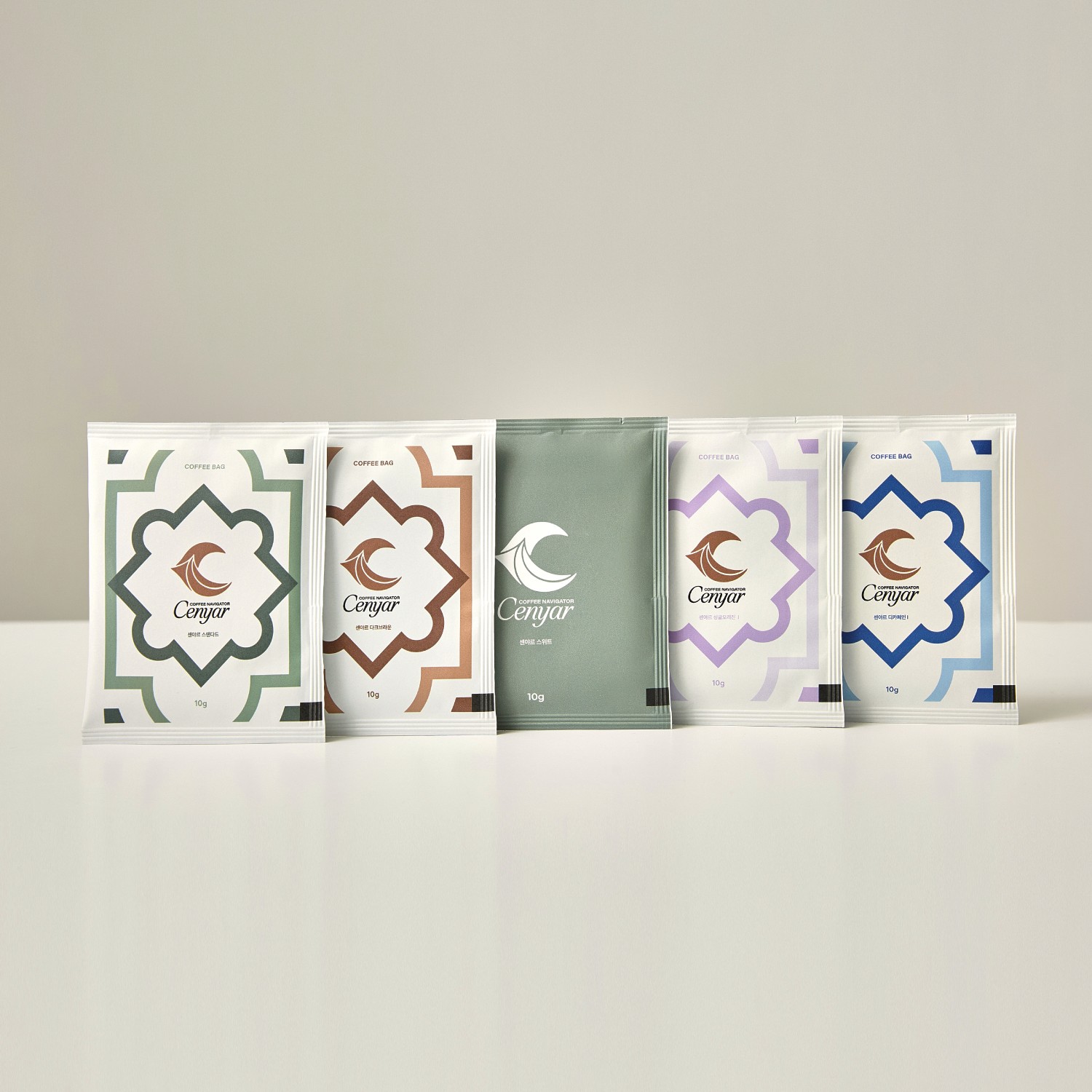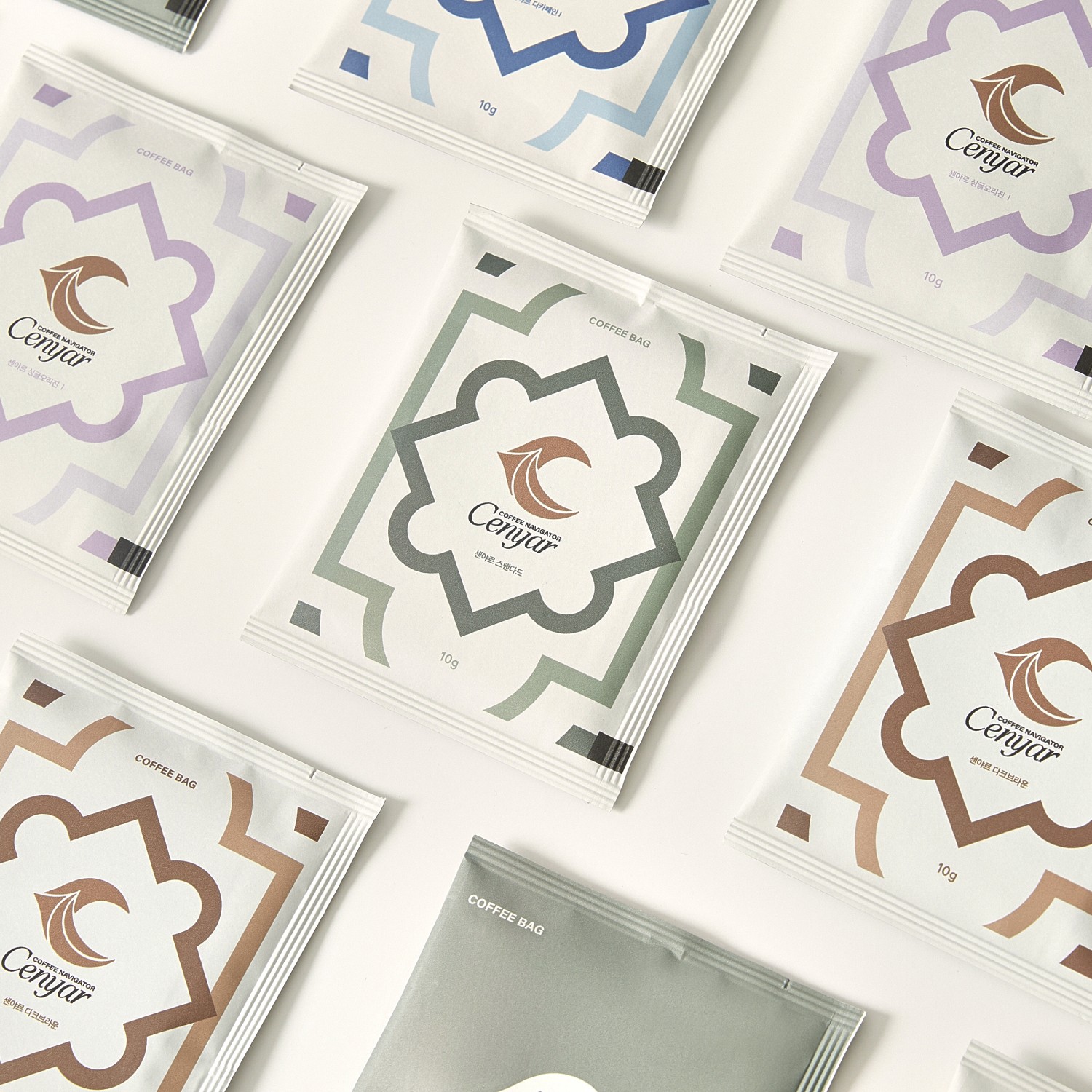 전통 문양을 현대적으로 재해석한 그래픽 구조를 통해 브랜드 아이덴티티를 구축한 커피 패키지입니다. 차분한 컬러와 심플한 구성으로 프리미엄 이미지를 강조합니다.