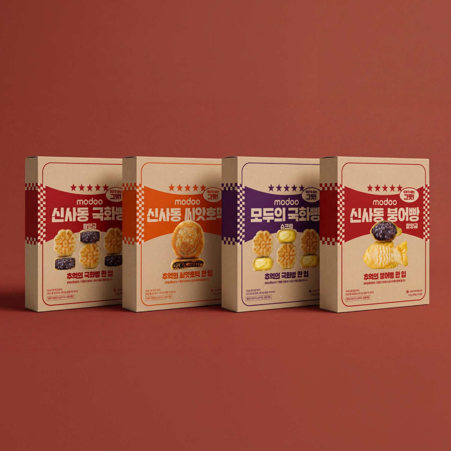 레트로 패키지 스타일과 강한 컬러 대비를 통해 길거리 간식의 향수를 현대적으로 재해석한 브랜드입니다. 제품별 컬러 코딩으로 직관적인 라인업 구성이 가능합니다.