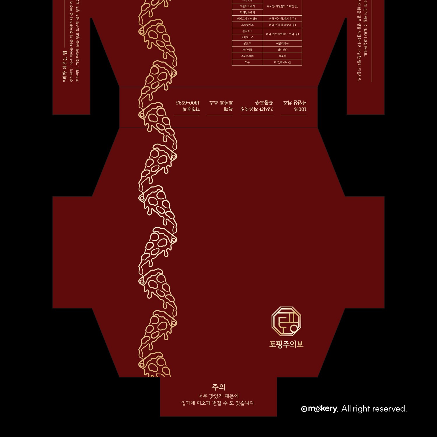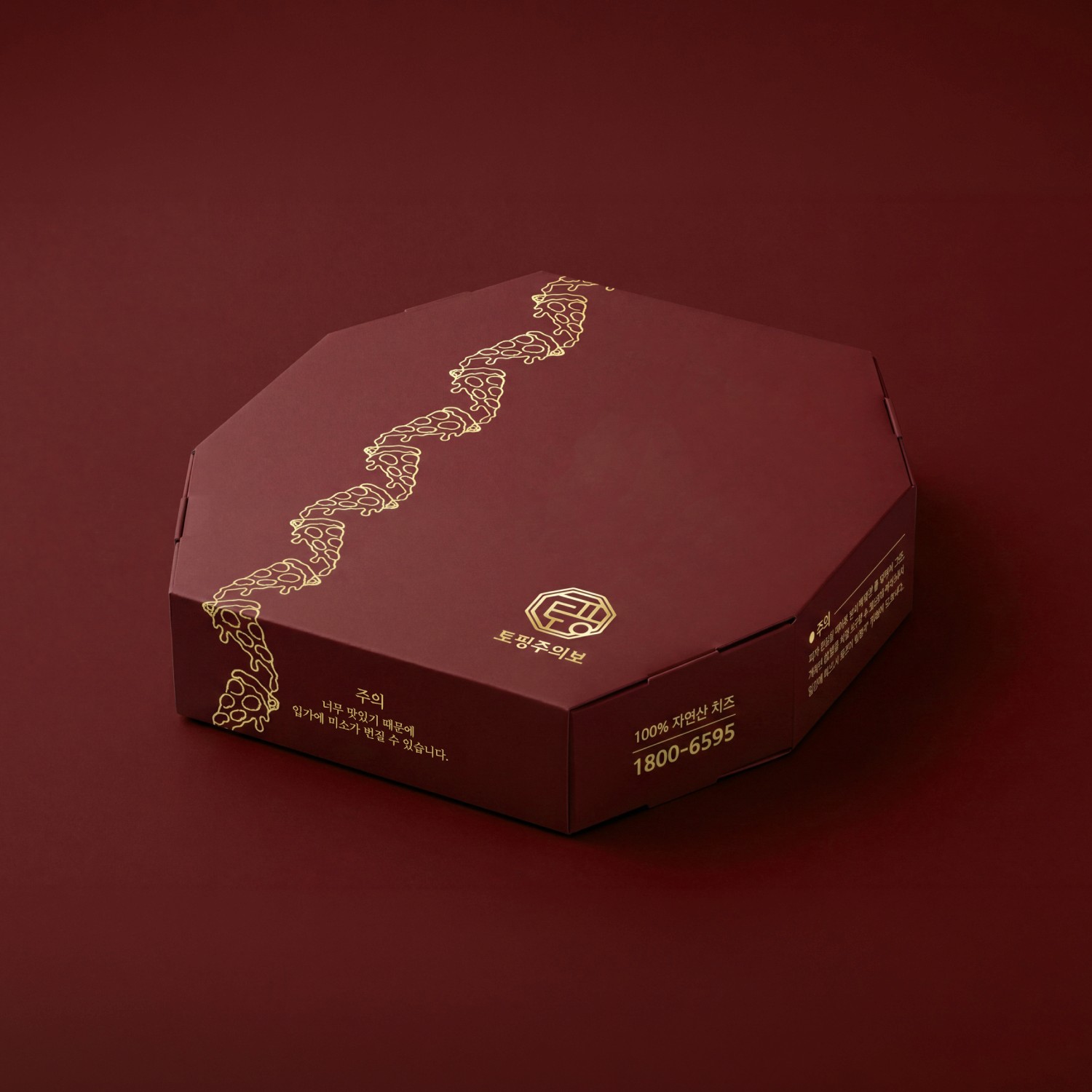 딥 레드 컬러와 골드 라인 일러스트를 활용해 고급스러운 피자 브랜드 이미지를 강조한 패키지입니다. 심플한 그래픽 포인트로 브랜드 아이덴티티를 강하게 각인시키는 디자인입니다.
