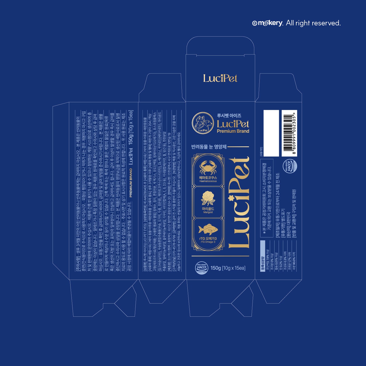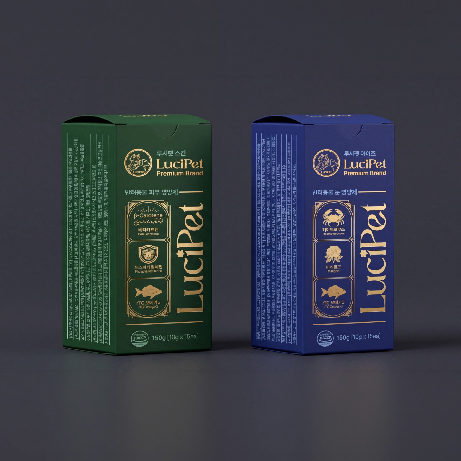 딥 블루 컬러와 골드 포인트를 활용해 프리미엄 반려동물 브랜드 이미지를 구축했습니다. 정보 중심 레이아웃으로 신뢰성과 전문성을 강조합니다.