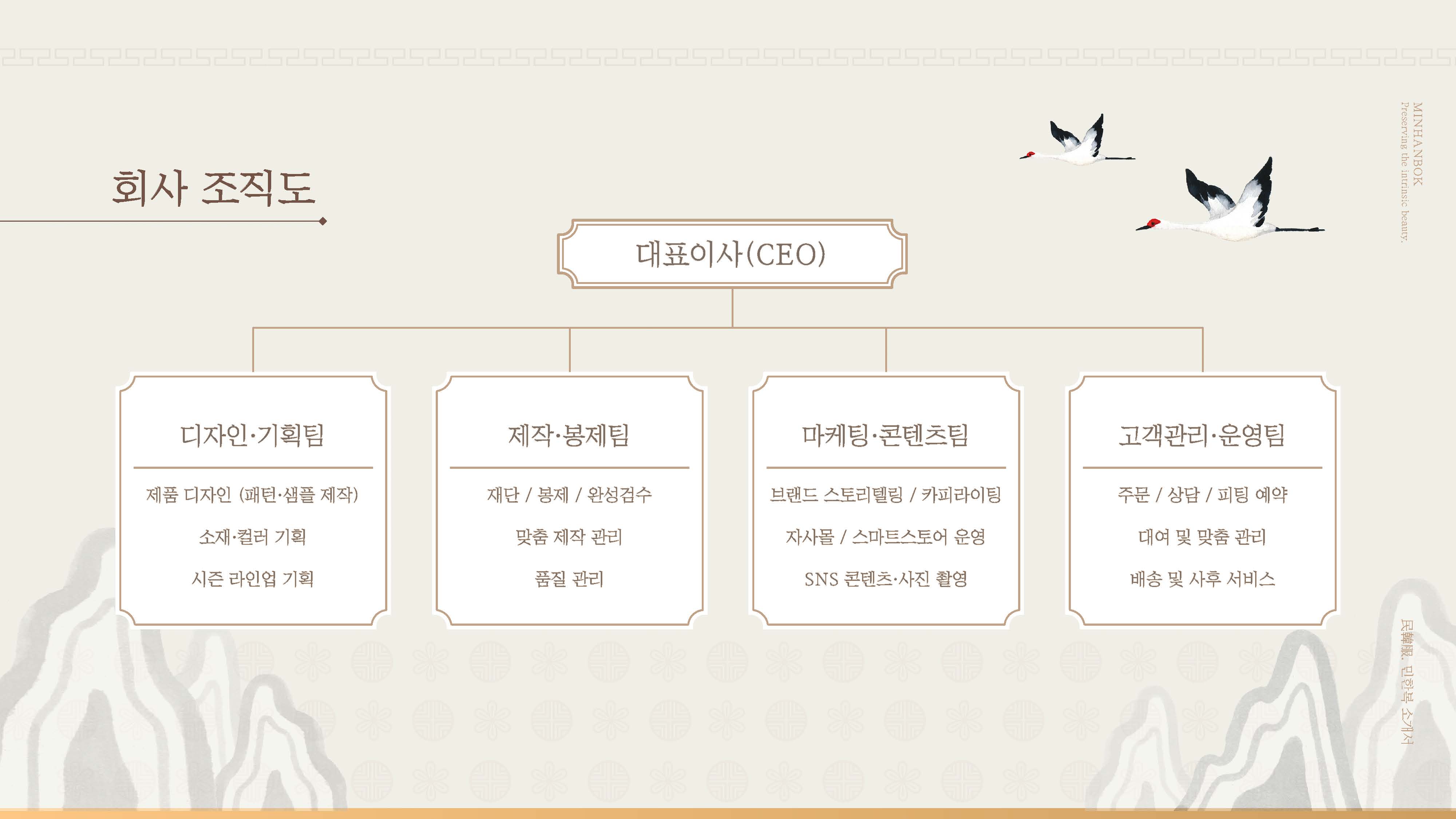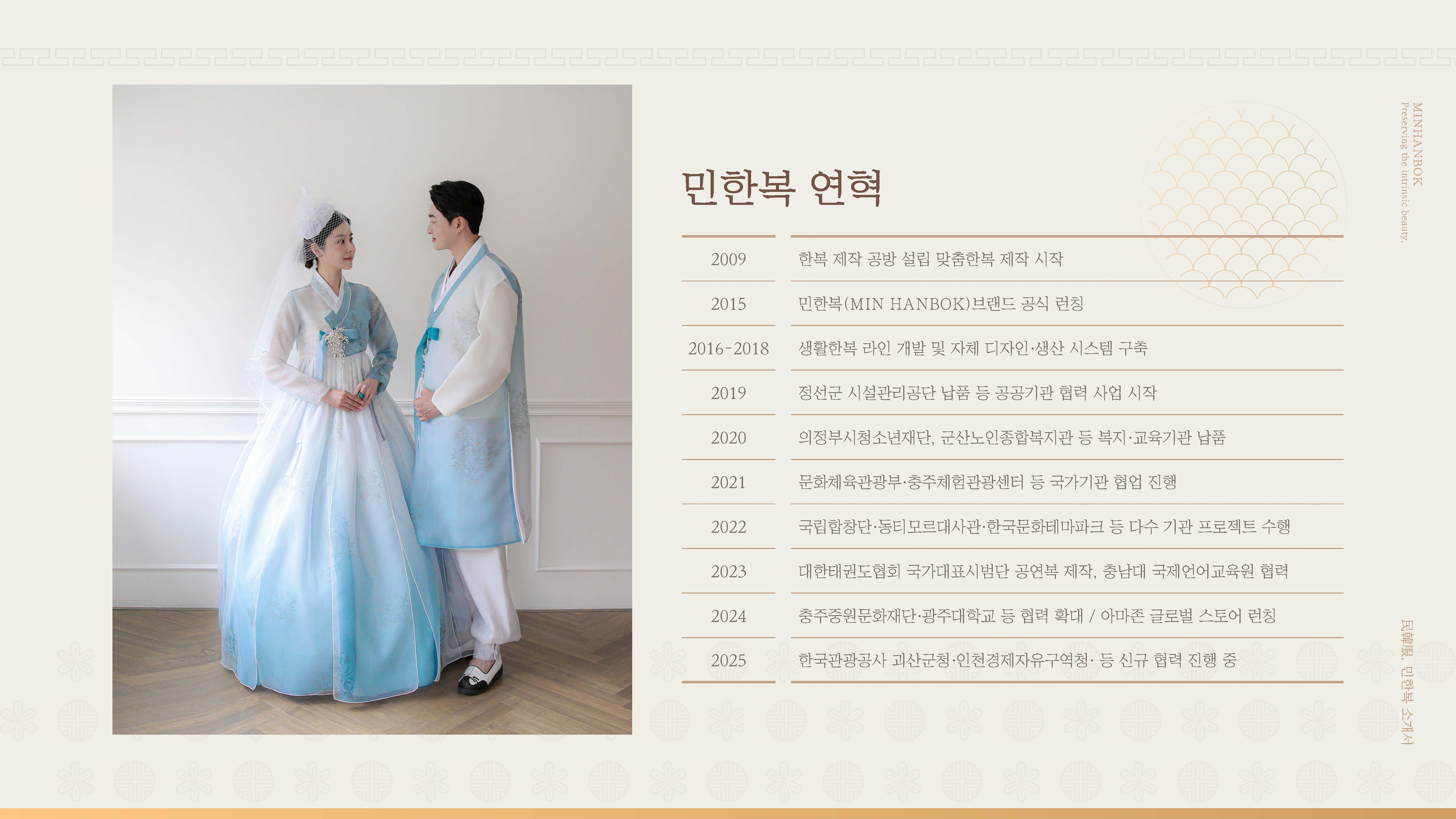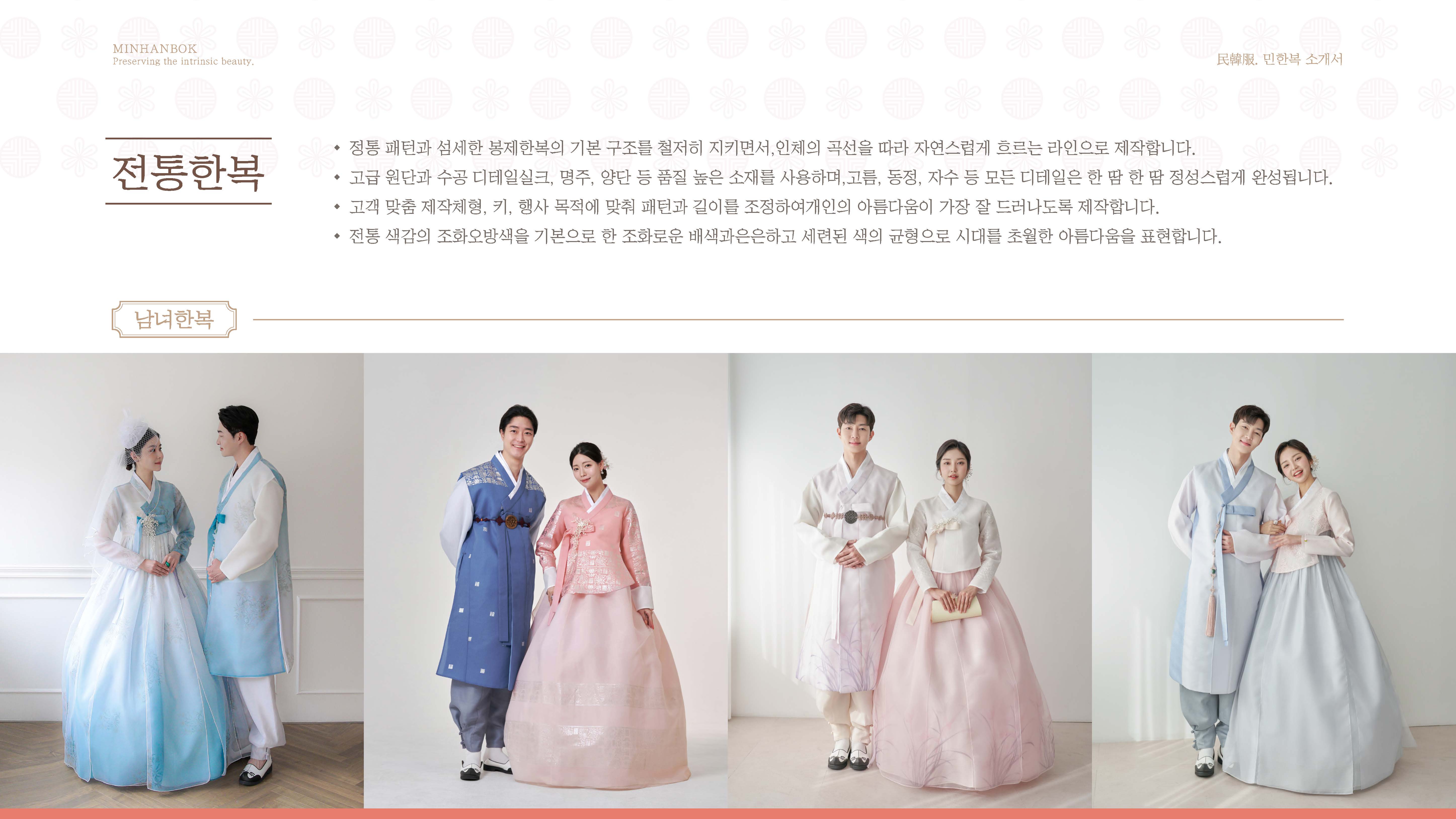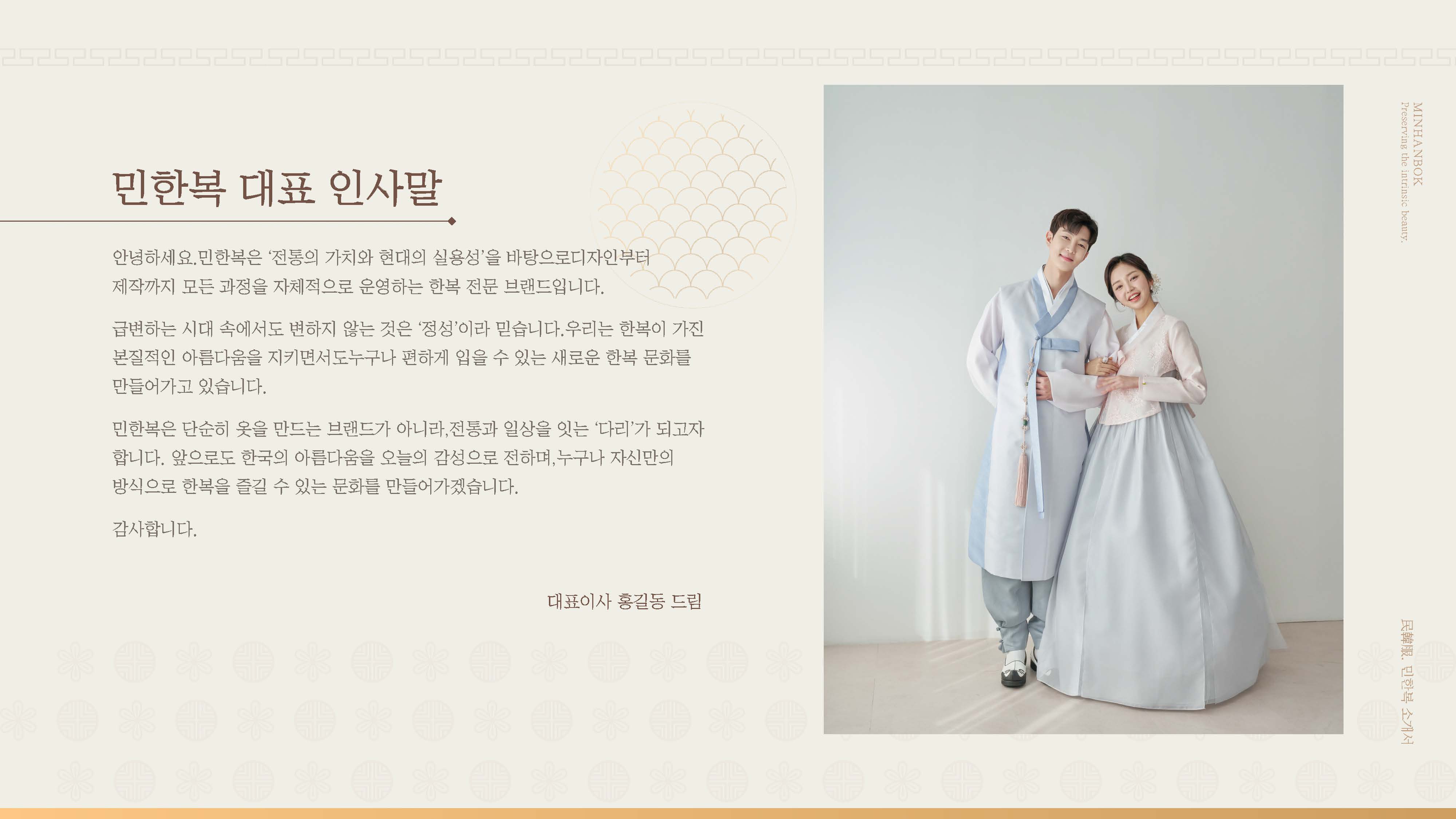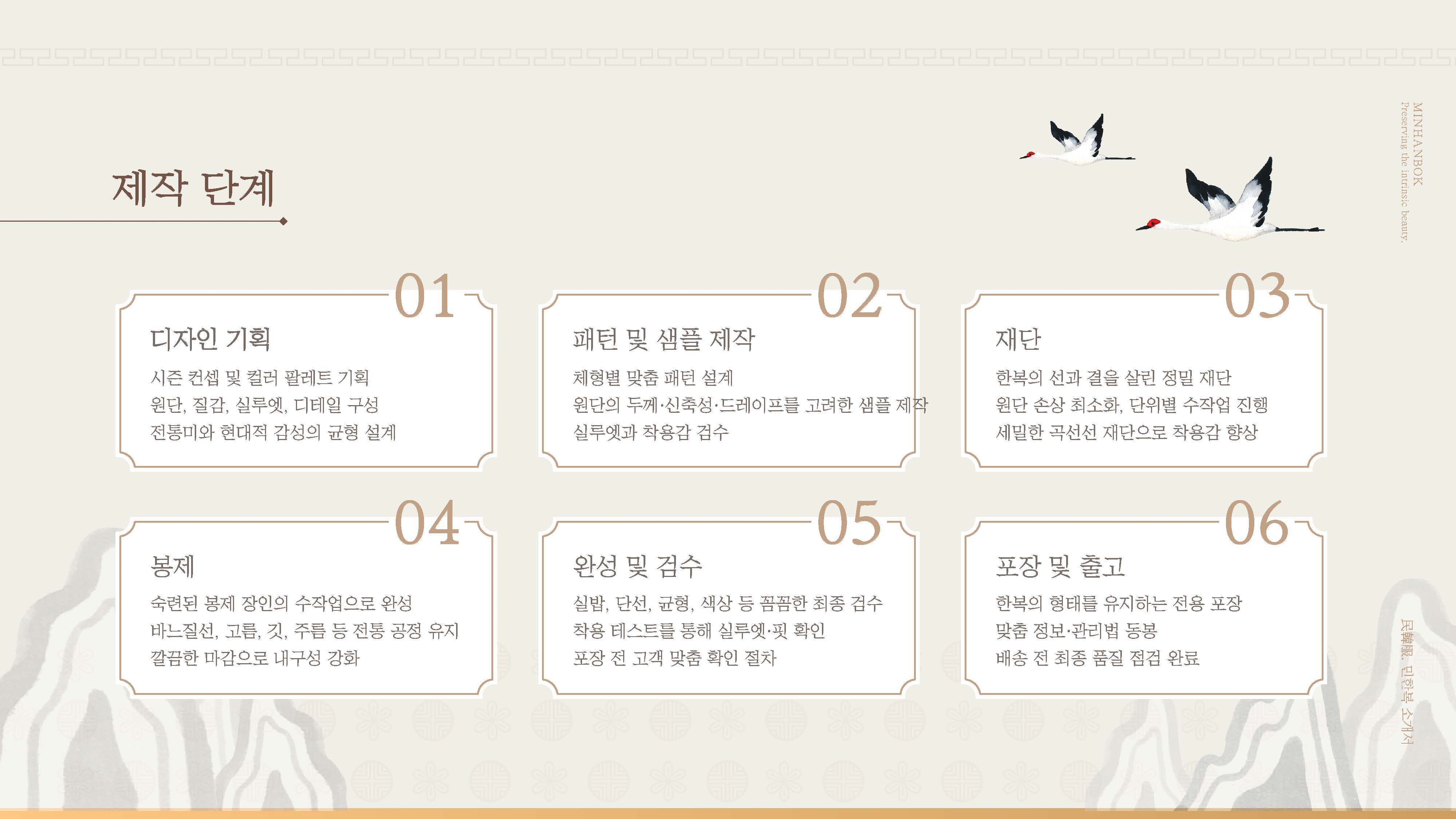 민한복 브랜드의 전통성과 제작 경쟁력을 효과적으로 전달하기 위한 회사소개서 PPT 디자인 프로젝트입니다. 브랜드 스토리, 제작 공정, 조직 구성 등 핵심 콘텐츠를 중심으로 정보 구조를 재정리하고 시각적으로 표현했습니다. 전통적인 한복의 미감을 살린 컬러와 그래픽 요소를 활용하여 브랜드 아이덴티티와 고급스러운 이미지를 강화하는 데 중점을 두었습니다.