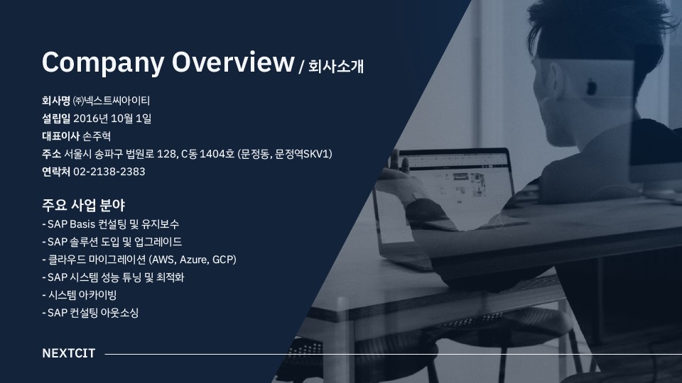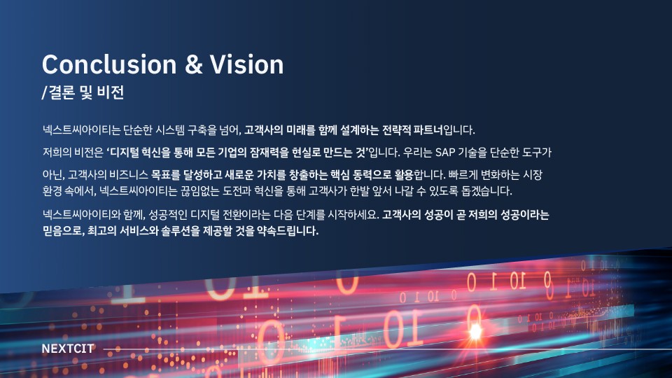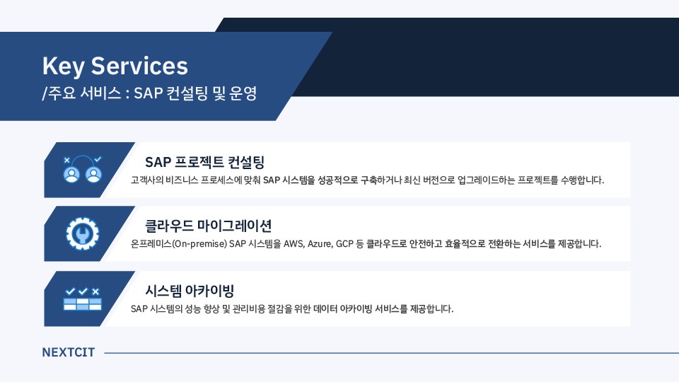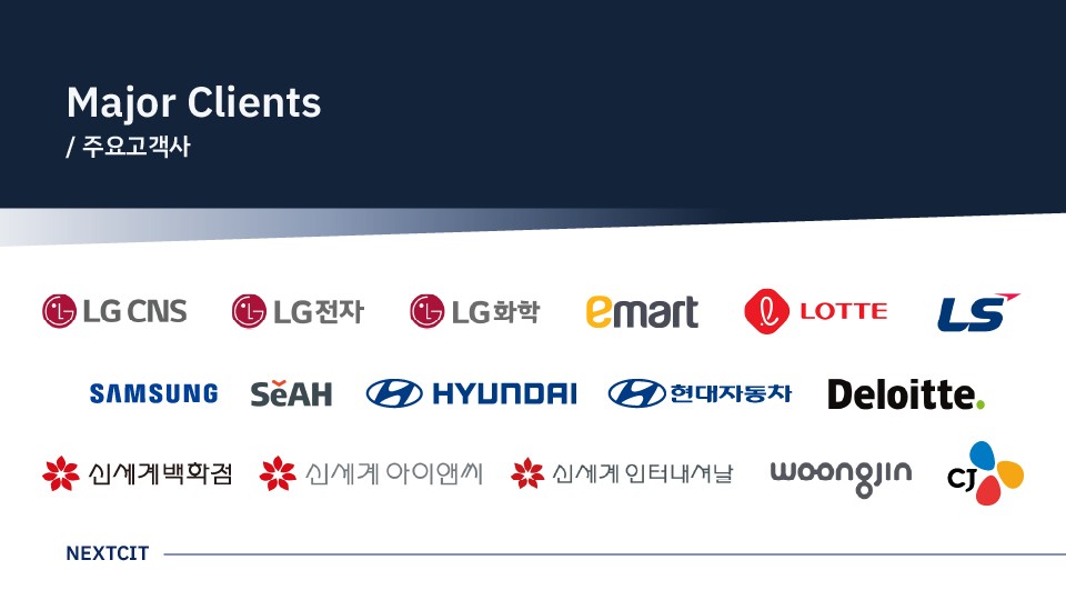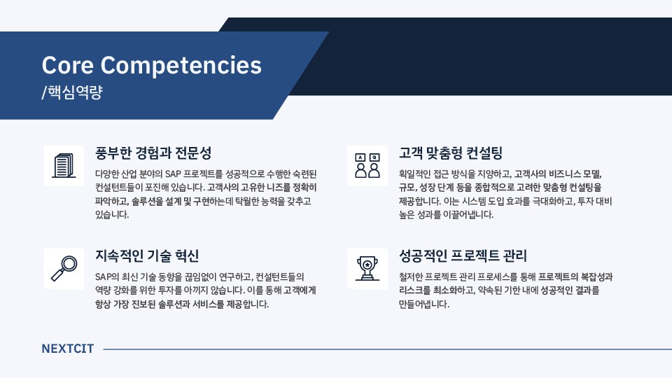 넥스트씨아이티의 사업 영역과 기술 경쟁력을 효과적으로 전달하기 위한 회사소개서 PPT 디자인 프로젝트입니다. SAP 컨설팅, 클라우드 마이그레이션 등 핵심 서비스를 중심으로 콘텐츠를 재구성하고 정보 전달력을 강화했습니다. IT 기업 특성에 맞는 블루 톤 기반의 디자인과 구조적인 레이아웃을 통해 전문성과 신뢰감을 강조하는 데 중점을 두었습니다.