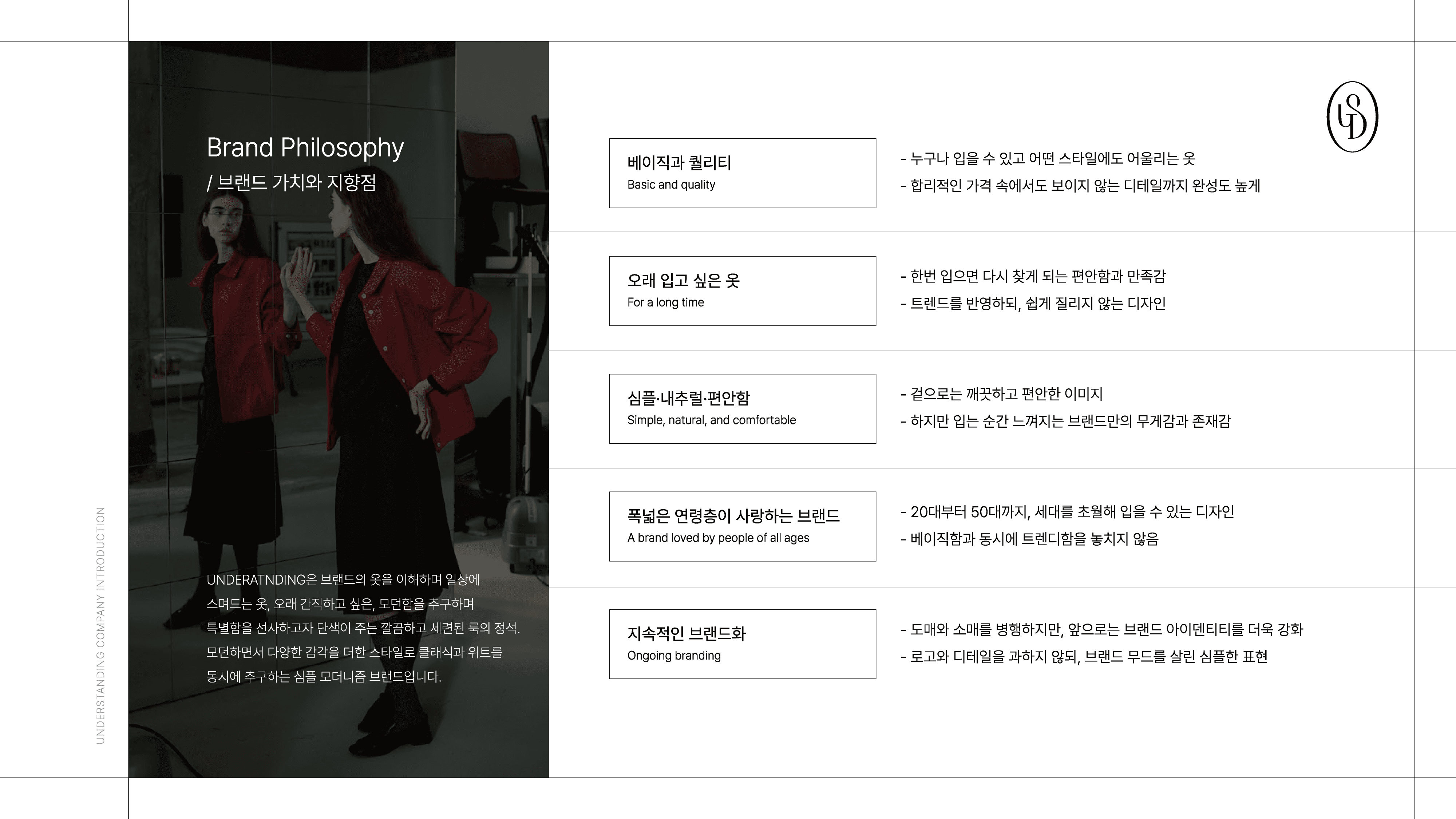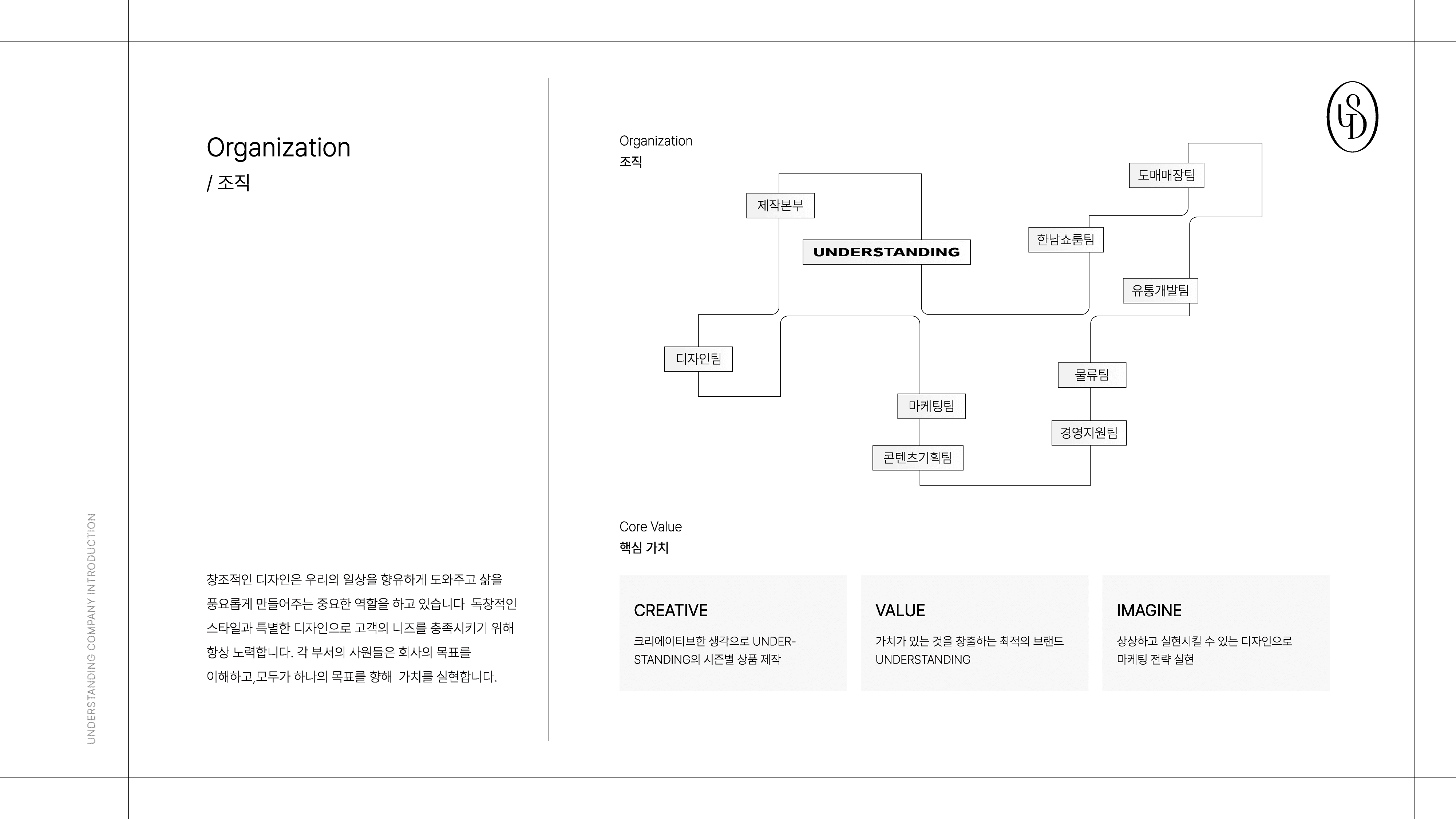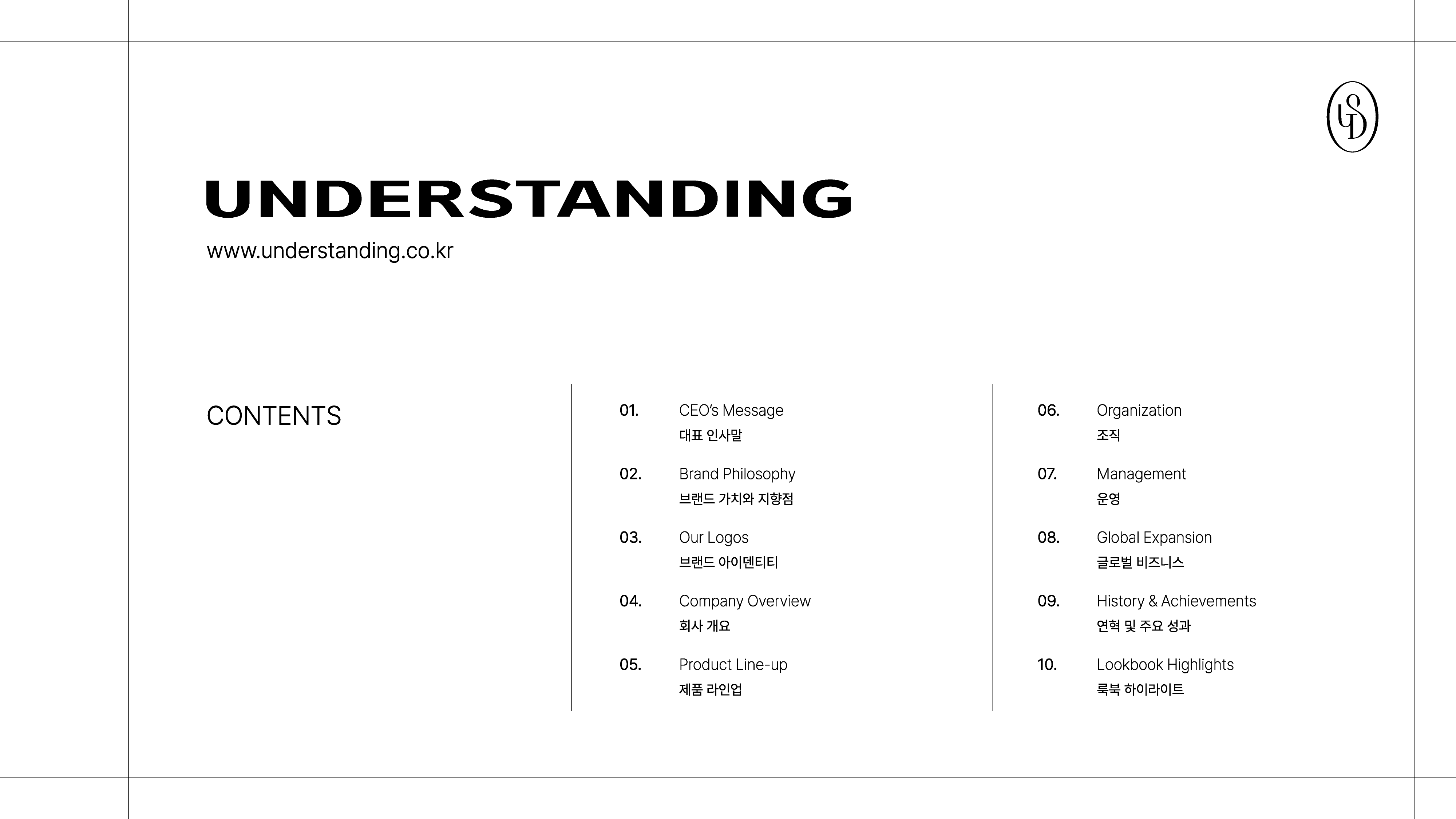UNDERSTANDING 브랜드의 정체성과 운영 구조를 효과적으로 전달하기 위한 회사소개서 PPT 디자인 프로젝트입니다. 브랜드 철학, 제품 라인업, 조직 및 글로벌 확장 전략 등 핵심 콘텐츠를 시각적으로 구조화하여 정보 전달력을 강화했습니다.