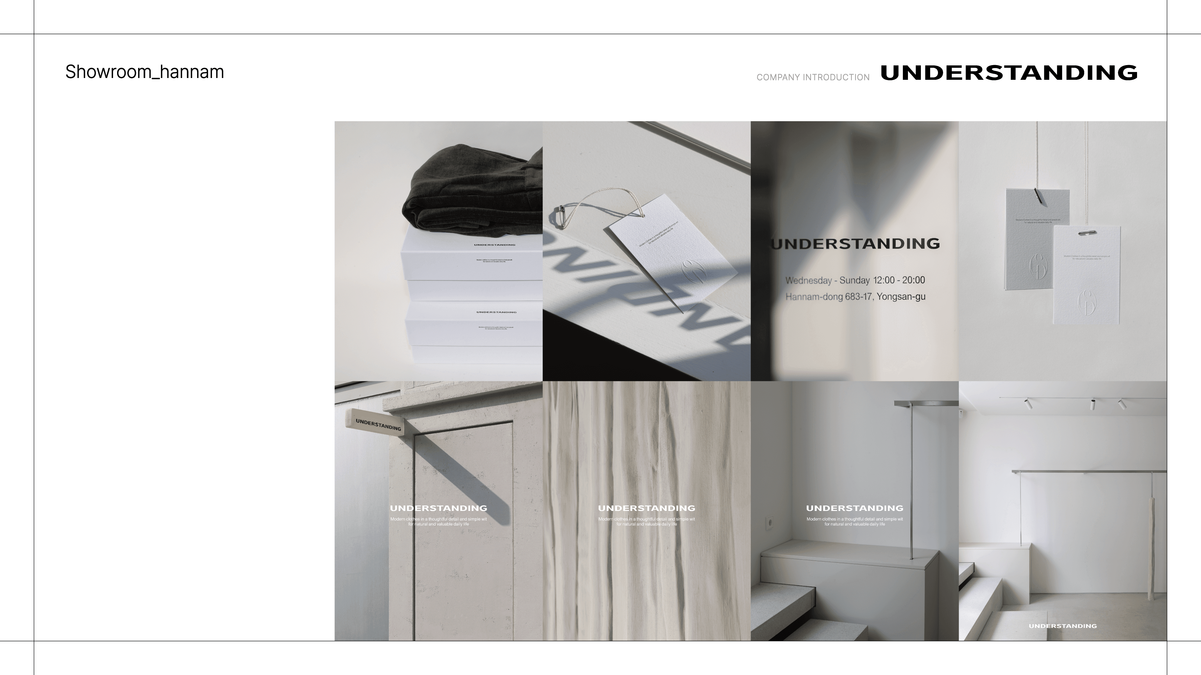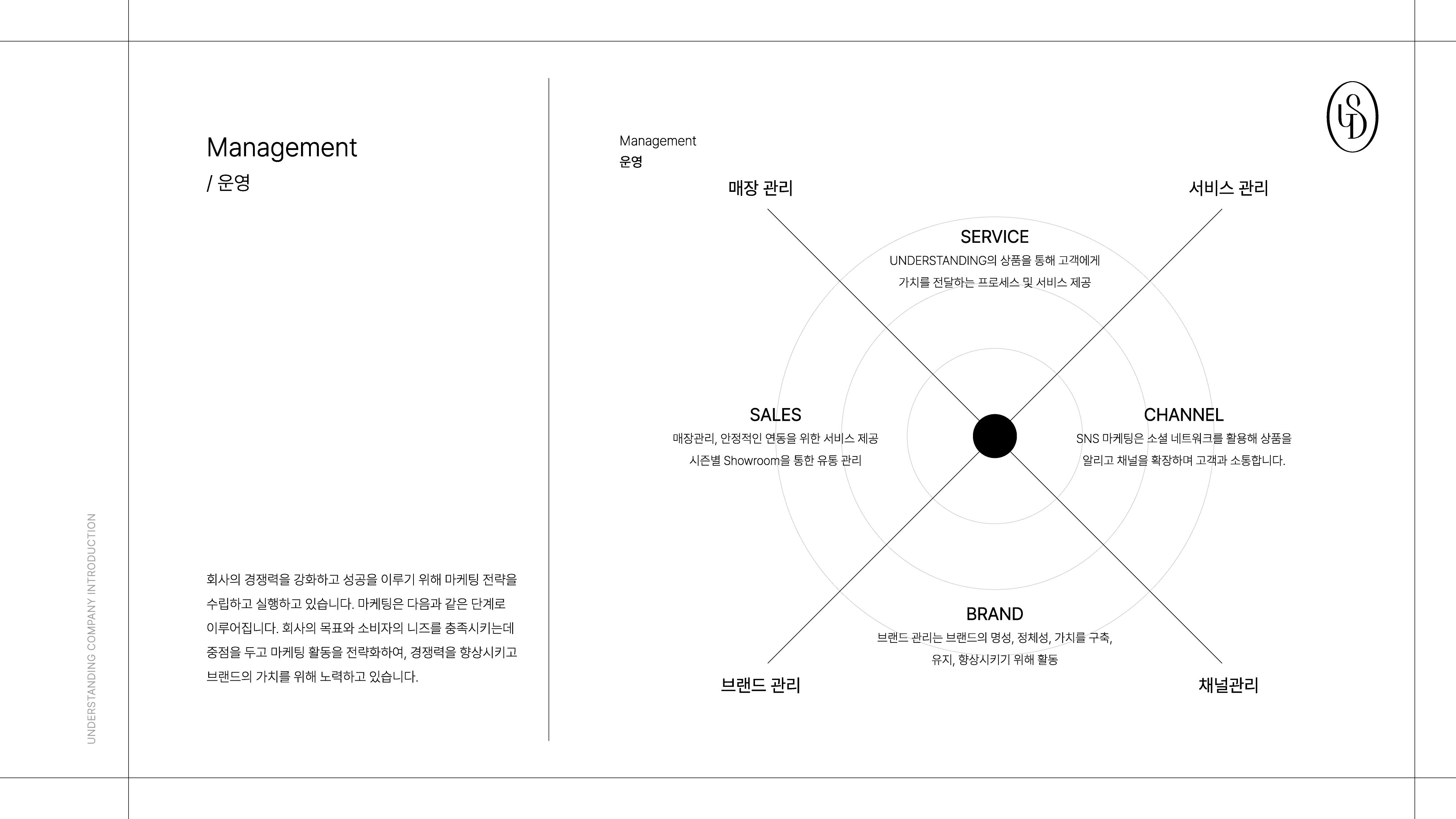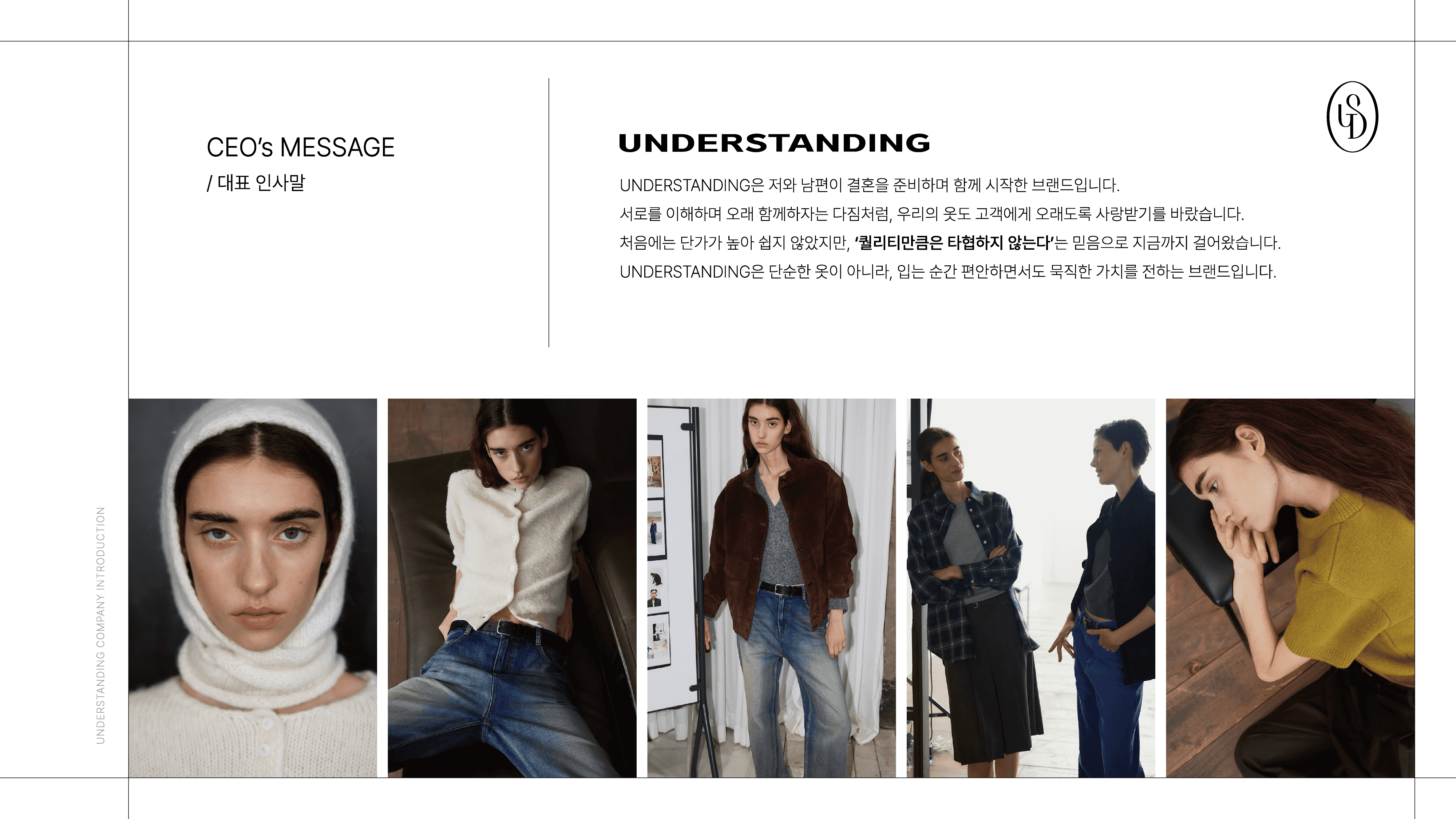 UNDERSTANDING 브랜드의 정체성과 운영 구조를 효과적으로 전달하기 위한 회사소개서 PPT 디자인 프로젝트입니다. 브랜드 철학, 제품 라인업, 조직 및 글로벌 확장 전략 등 핵심 콘텐츠를 시각적으로 구조화하여 정보 전달력을 강화했습니다.