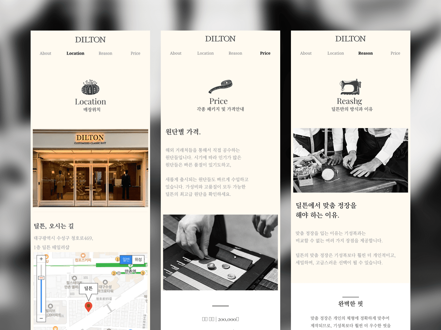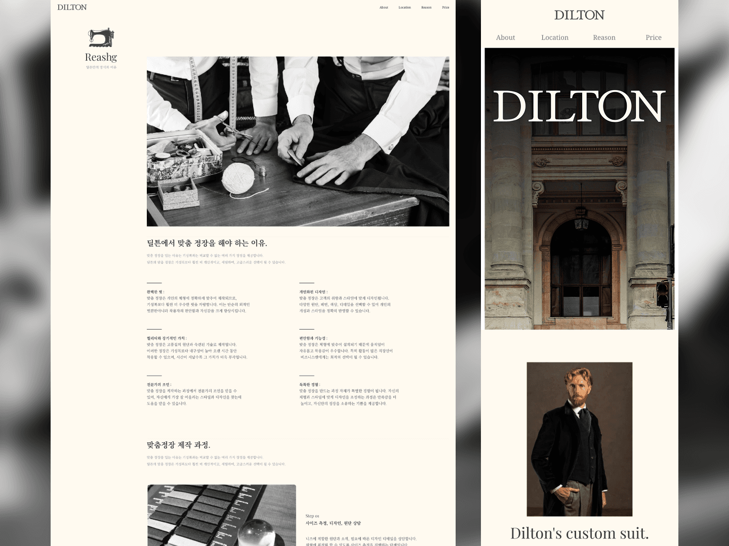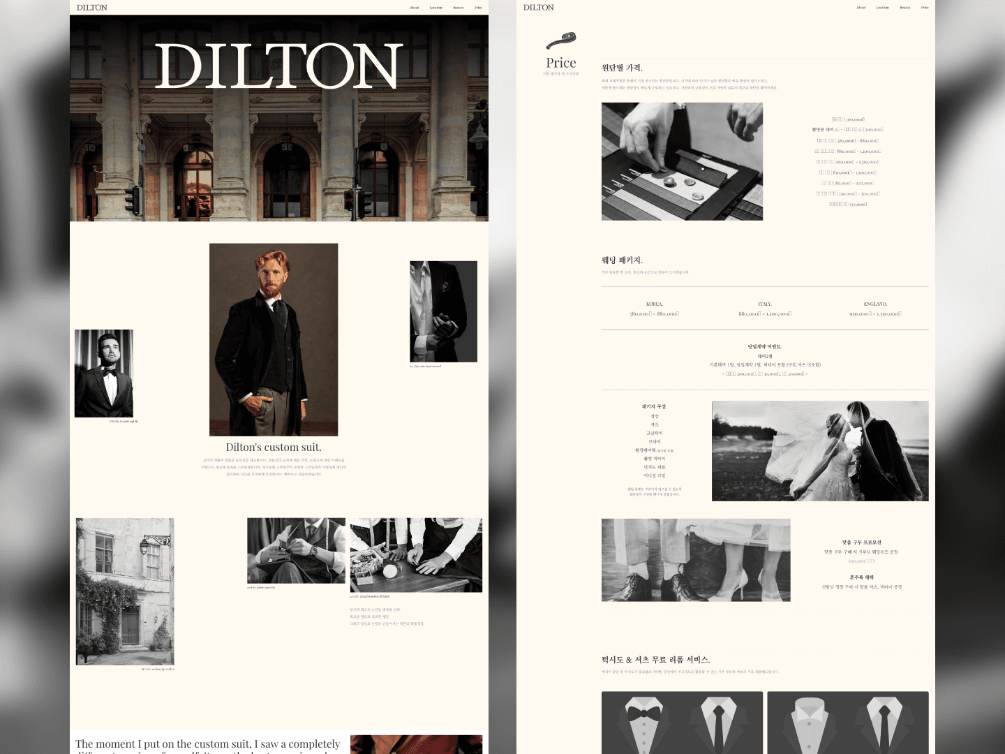 프리미엄 맞춤 정장 브랜드의 클래식한 무드를 반영하여 타이포그래피 중심의 고급스러운 레이아웃으로 설계했습니다. 뉴트럴 톤과 흑백 이미지 활용을 통해 장인의 디테일과 브랜드 헤리티지를 강조했습니다.