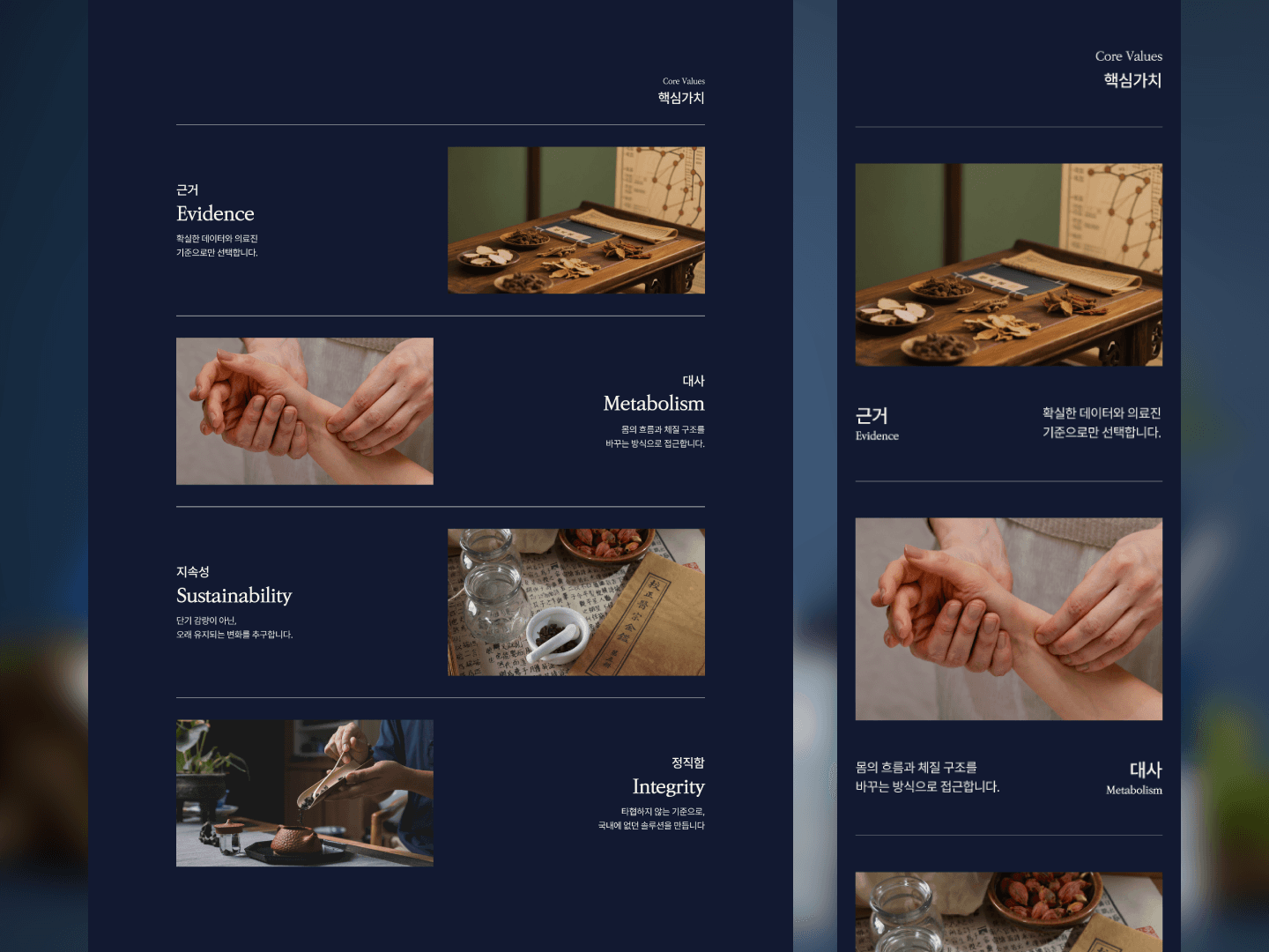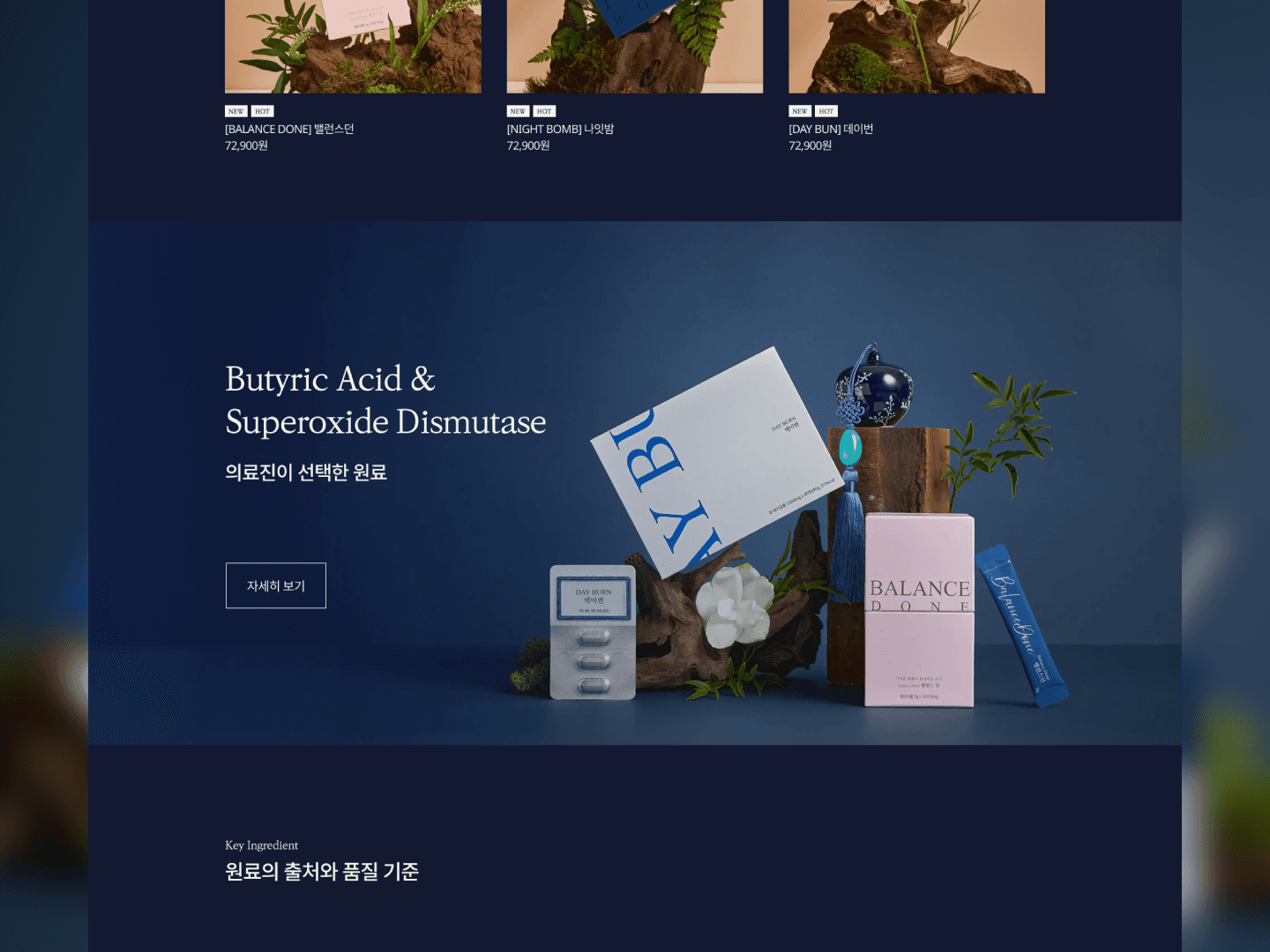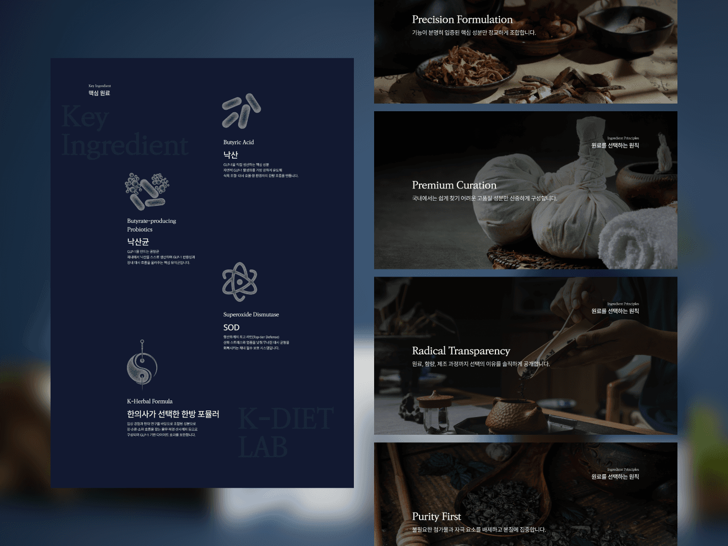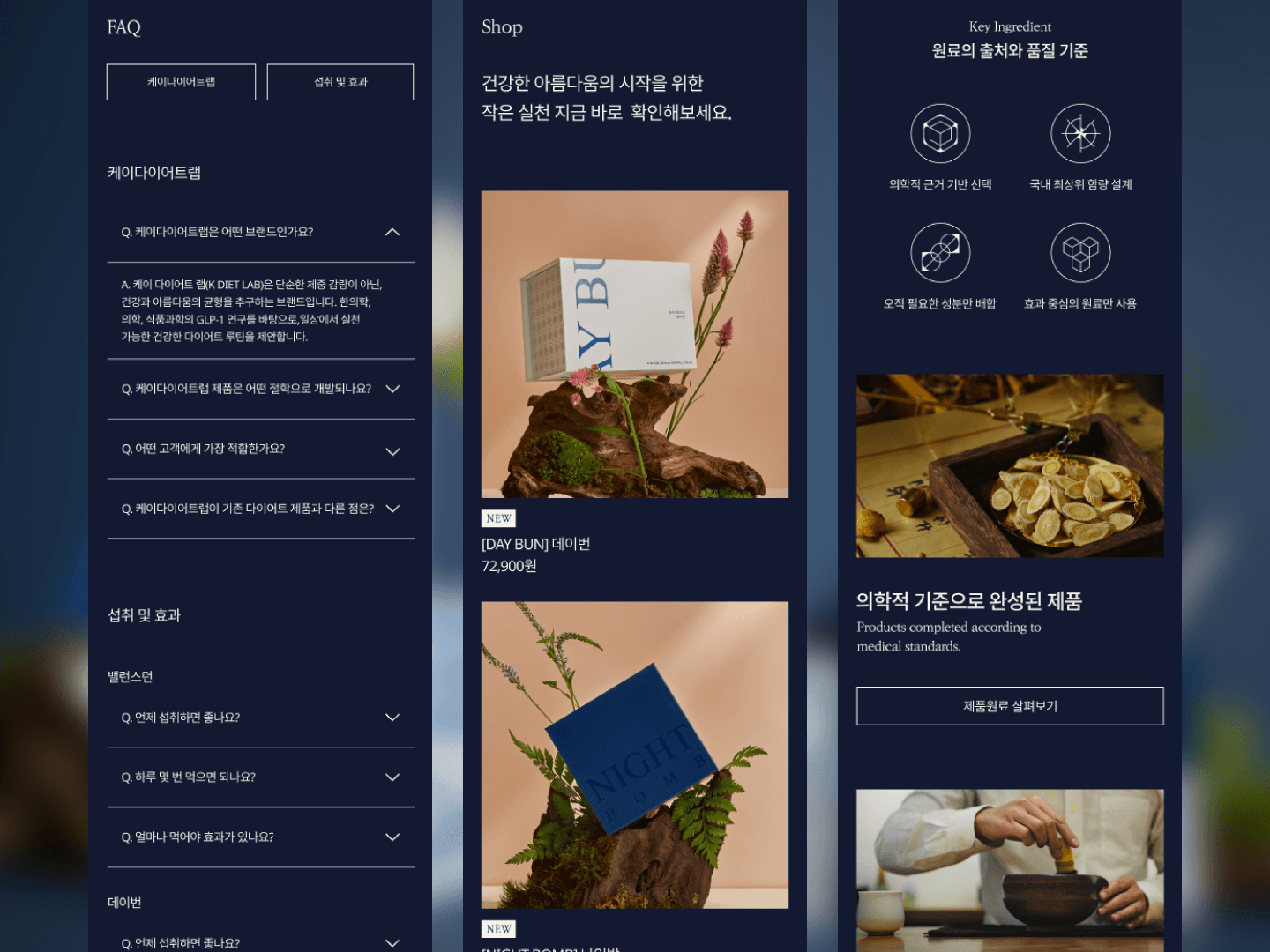 의학적 근거 기반의 프리미엄 건강기능식품 브랜드 컨셉에 맞춰 신뢰감 있는 비주얼과 구조로 설계했습니다. 딥네이비 컬러를 중심으로 한 정제된 UI와 원료·성분 중심 콘텐츠를 통해 전문성과 브랜드 가치를 강조했습니다.
